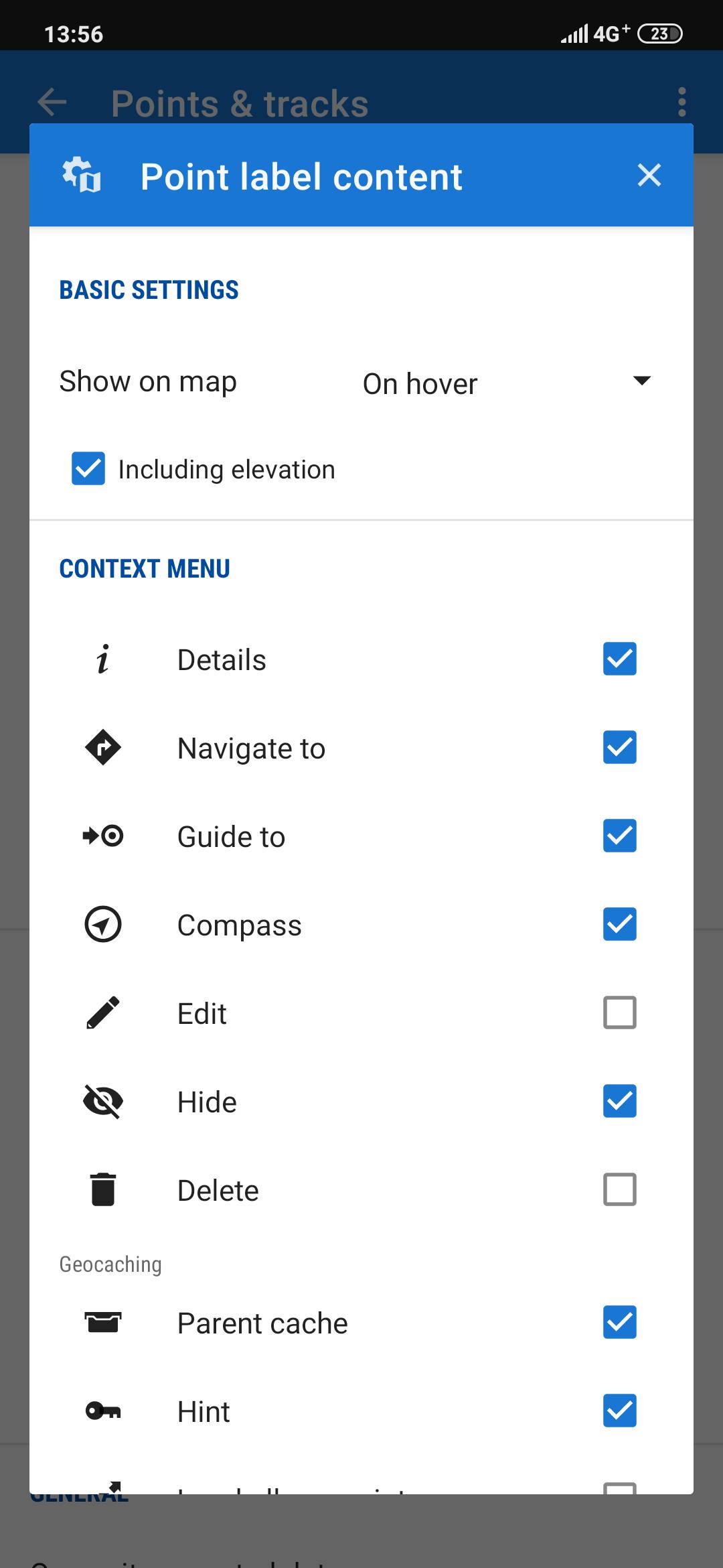 3) do you define individual point icons or do you save points in specific folders that have custom icons? Do you use icons from Locus selection or icons added from elsewhere? Go to Locus settings > Points&Tracks > Point label content > Basic settings > Show on map - select "On hover". Check the same at the individual folder settings.