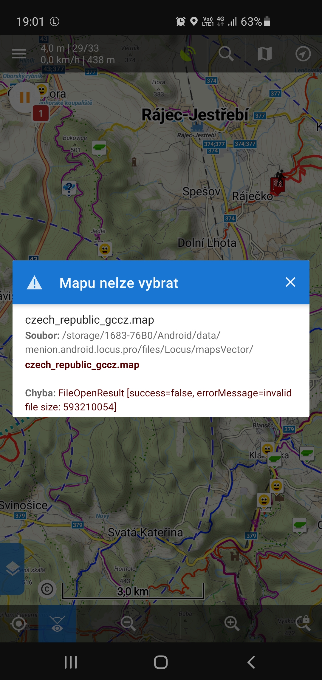Při startu Locusu se zobrazí hláška "invalid file size" - viz příloha.