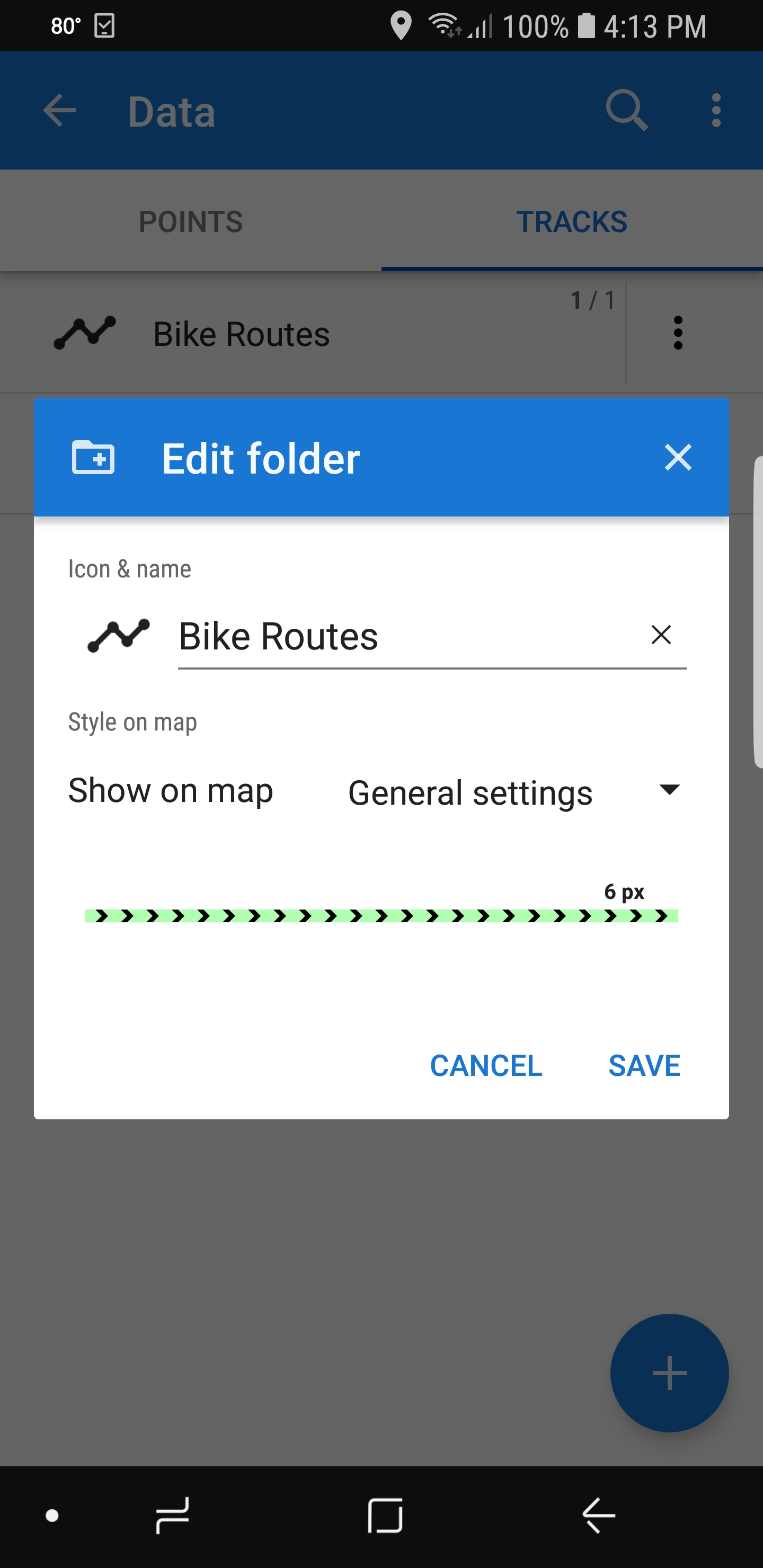 Bingo! Locus appears to be using the default track style which happens to be the SAME as the guidance line style INSTEAD of the line style set by the track FOLDER. I don't think that this is the intended behavior. The screen shots should make this clear.