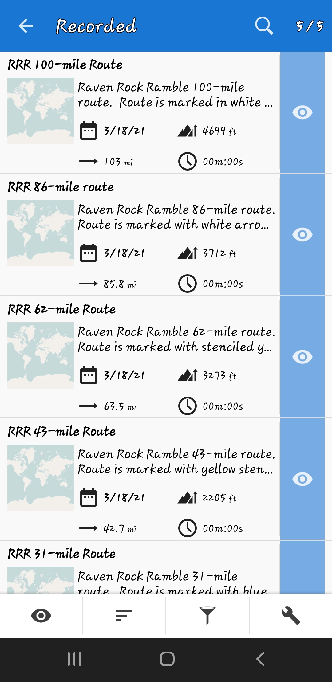 If I now go to the menu (upper right) and then pick "Tracks and Roues manager" and select the "Recorded" folder, I see the newly imported Track. The Track that was imported shows as expected with the exception that the Route Stamp (graphic on left side) is the entire world not the Track I just imported (see attachment Screenshot_locus Map_Worldview Stamp.jpg).