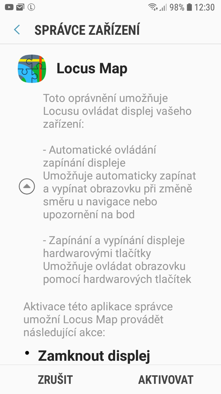 Pokud nepomůže, pak bych se podíval přímo do systémového nastavení > Security > Device admin apps. Zde by měl být vidět Locus Map a dle screenshotu co jste posílal, by měl být zapnutý. Pokud nenude, zkuste ho zde zapnout přímo.