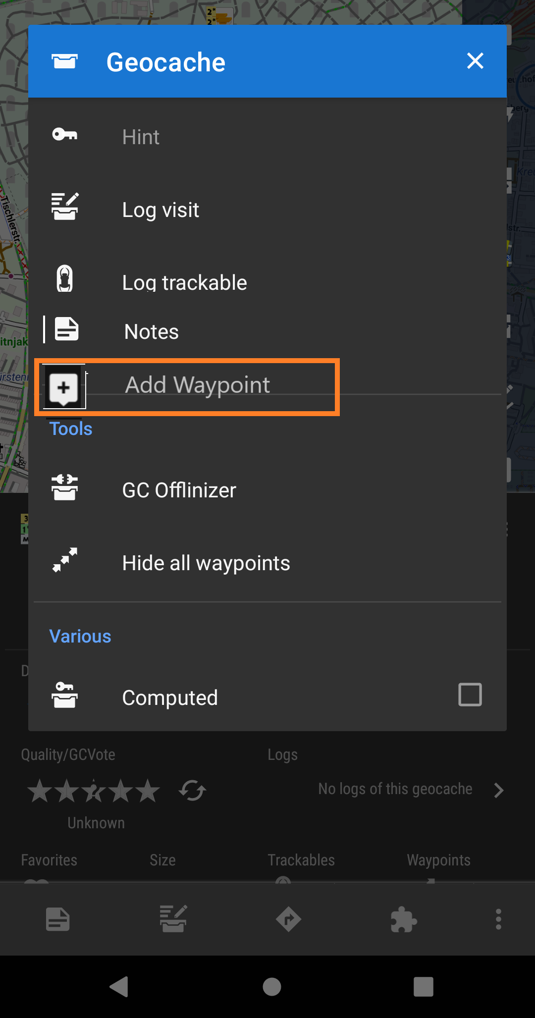 2. Cache waypoint detail already has a button to directly add a waypoint. Here is a need to swipe up, but then you get quick access to "add waypoint" feature.