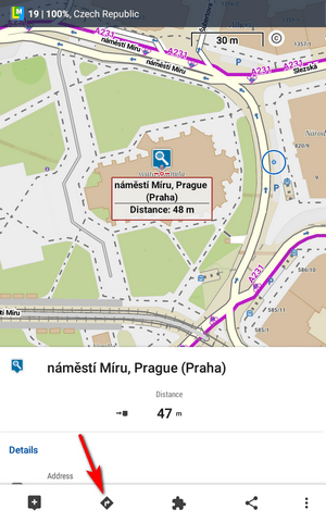 in Locus Map 3, if you tap and hold on any point on a map, you get a pop up rectangle which displays the address and has a ">" button: if you select that button you are given the chance to "Navigate to" or to "Guide on" the selected location.