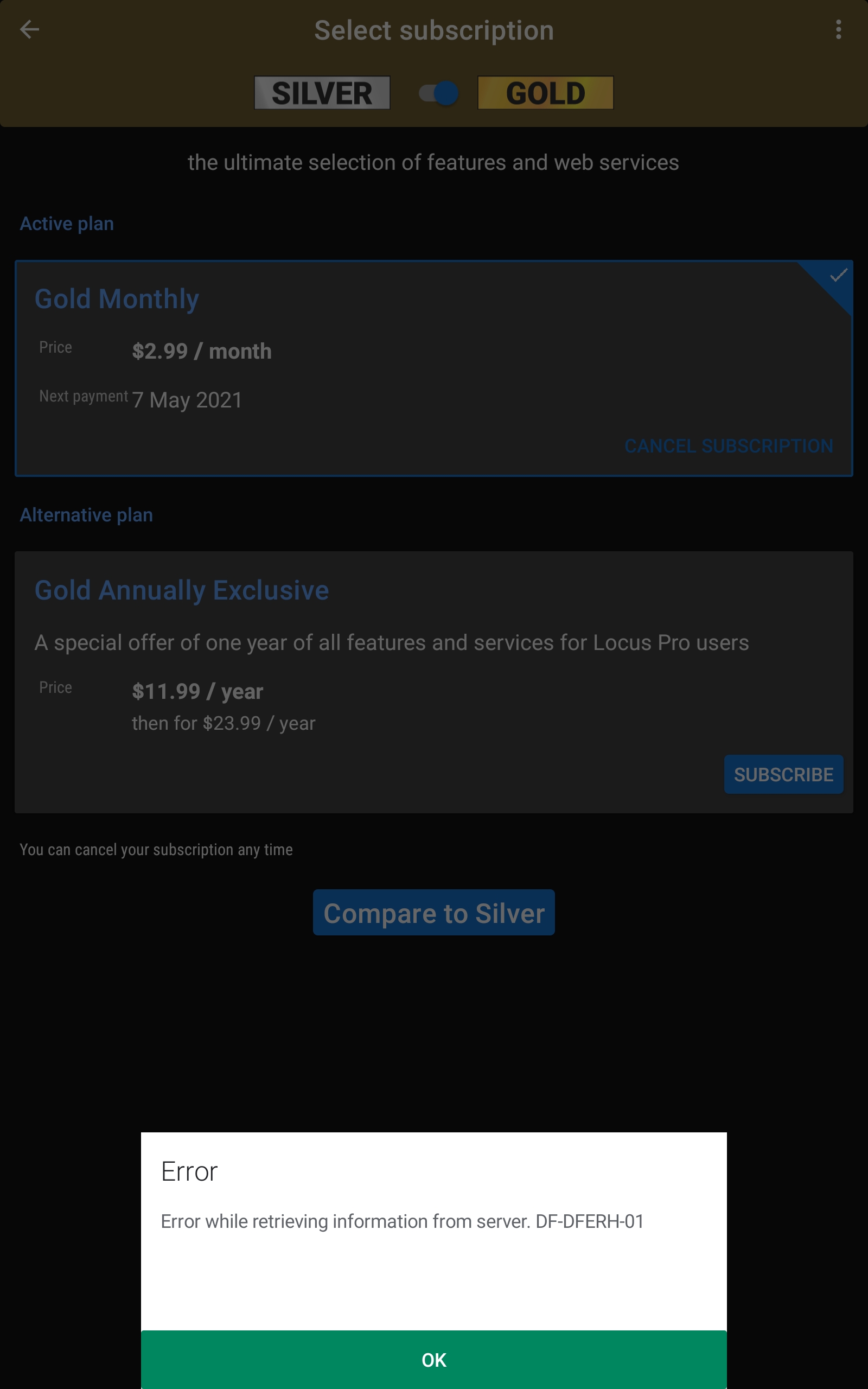 I have the same problem trying to switch from silver monthly to annually. I also tried cancelling the monthly subscription first, and that resulted in the same error.
