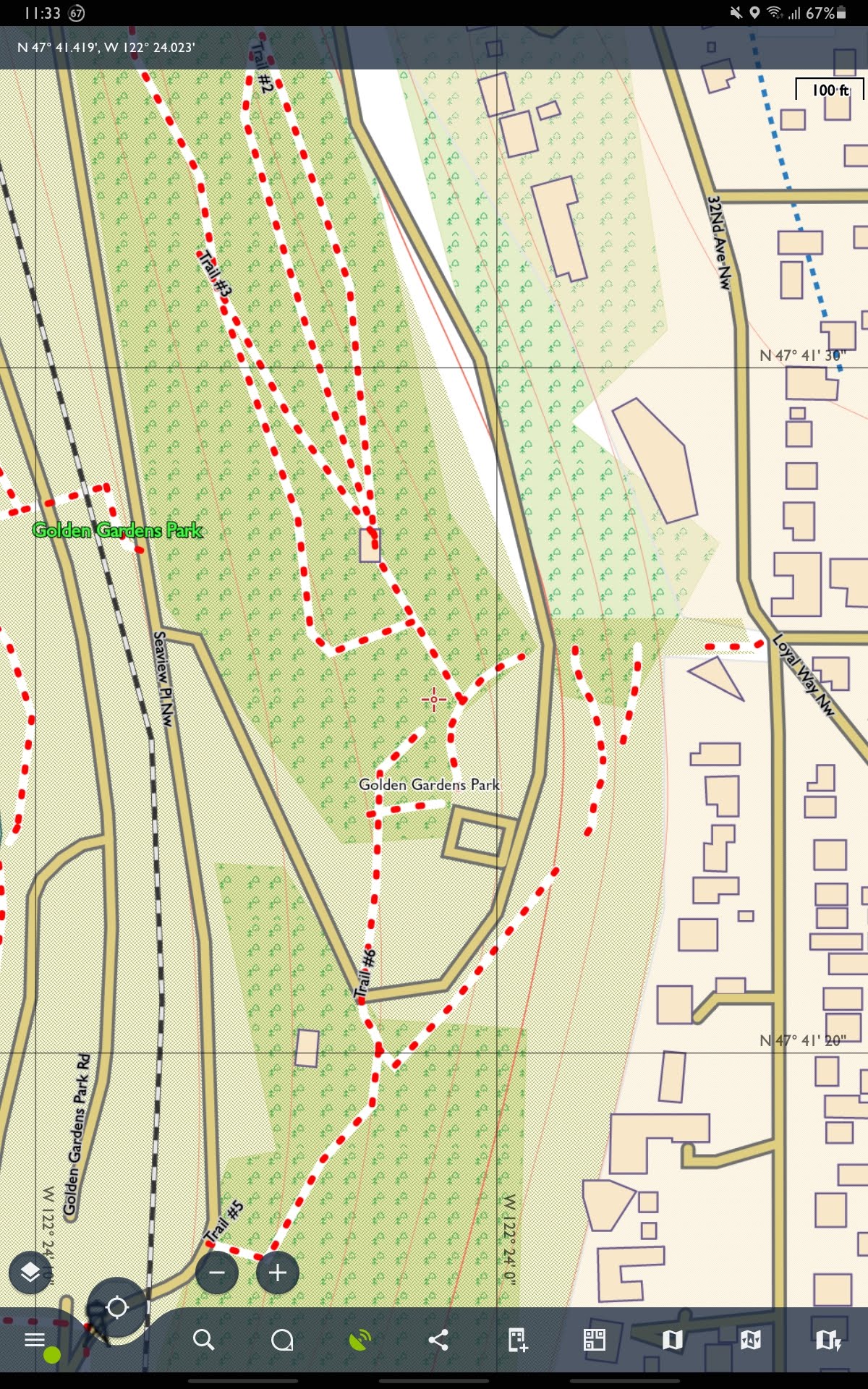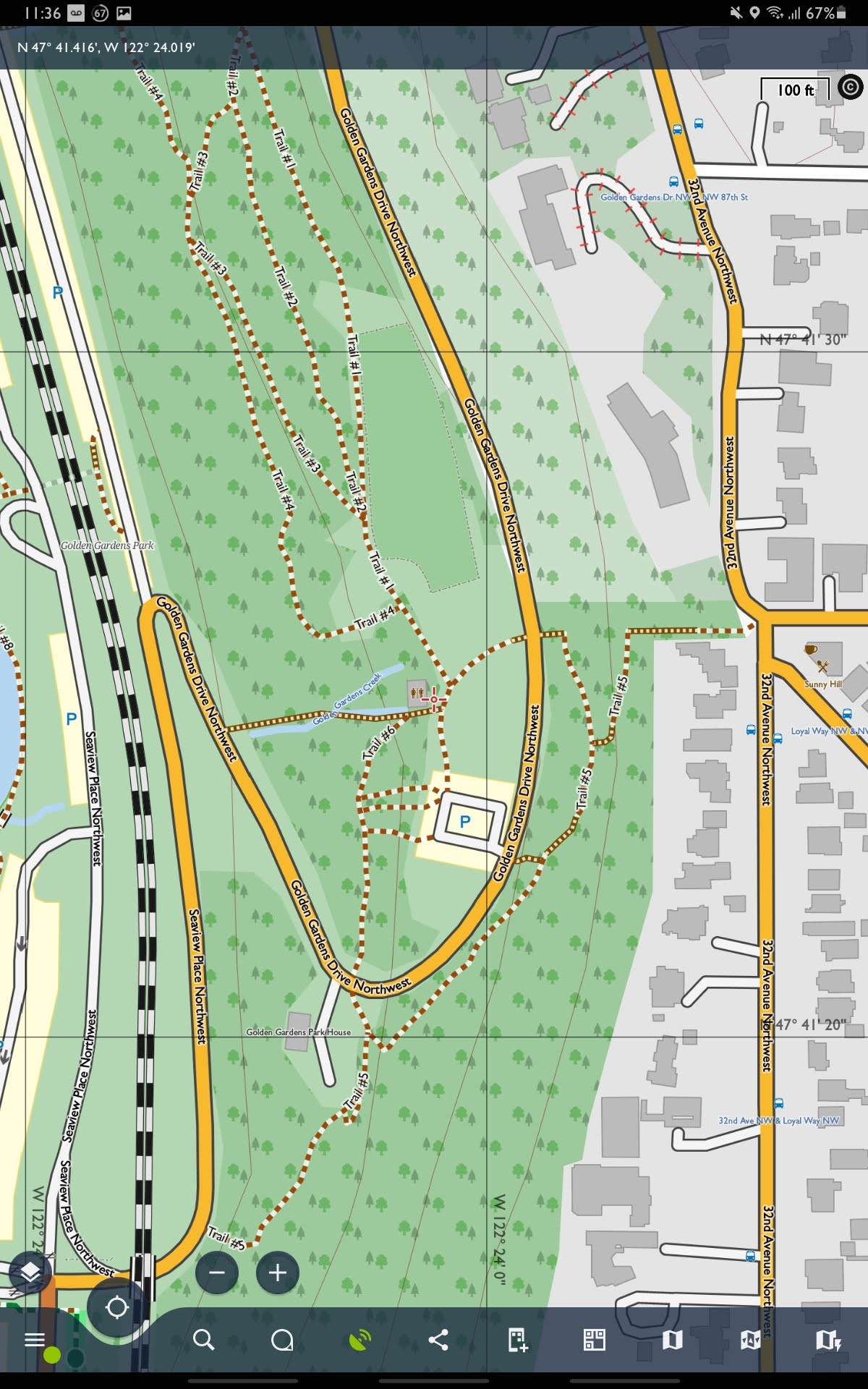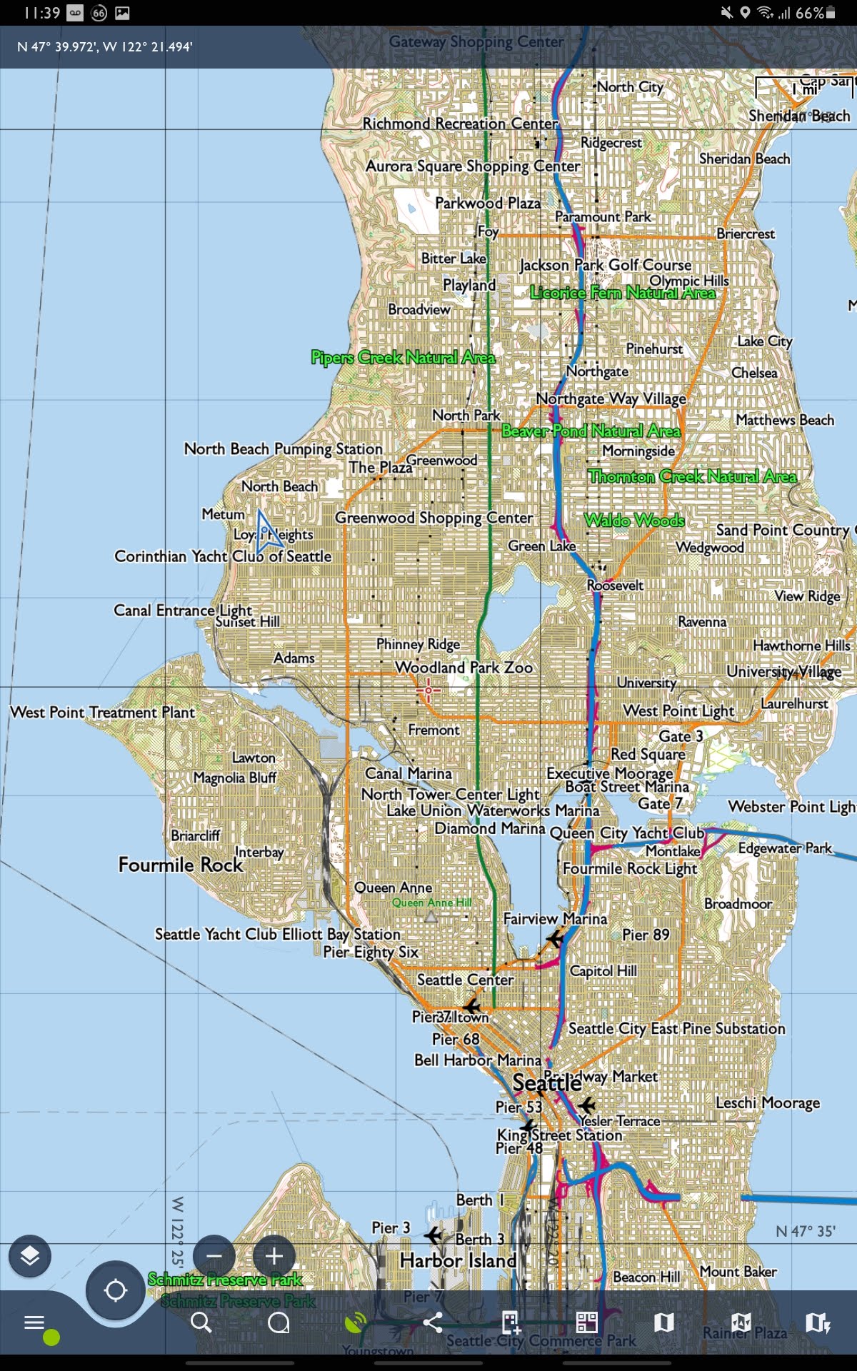 The location shown in the two zoomed-in views is in the upper left of the zoomed out Seattle view, between "Metum" and the GPS locator (my house). The coordinates are in the upper bar.