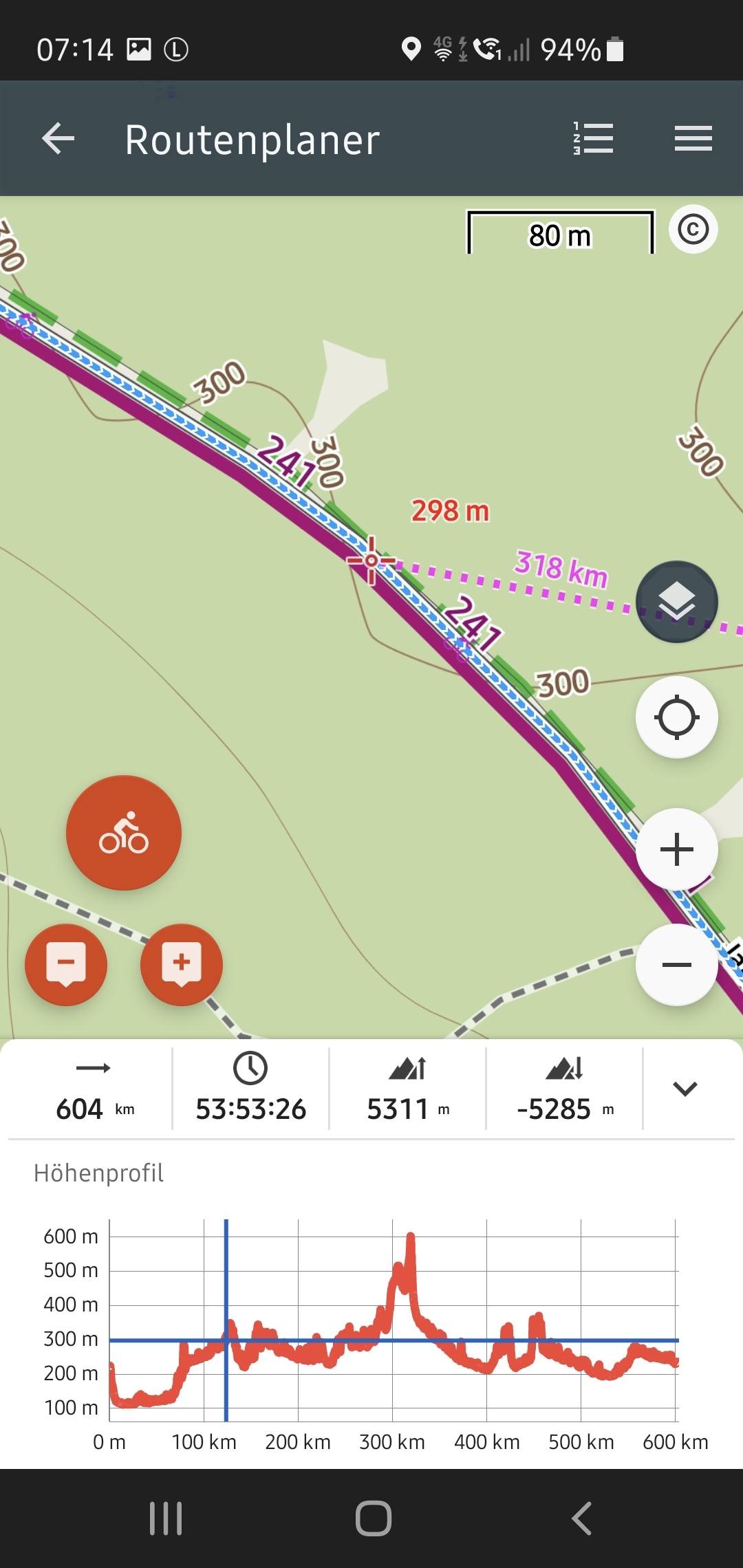 This screen is what I mean. When I have a km limit of e.g. 120 per day, I'd like to see that I'm near the 120 km to look for an overnight stay. After finding a Point therefore, I'd like to integrate its position into the planned track.