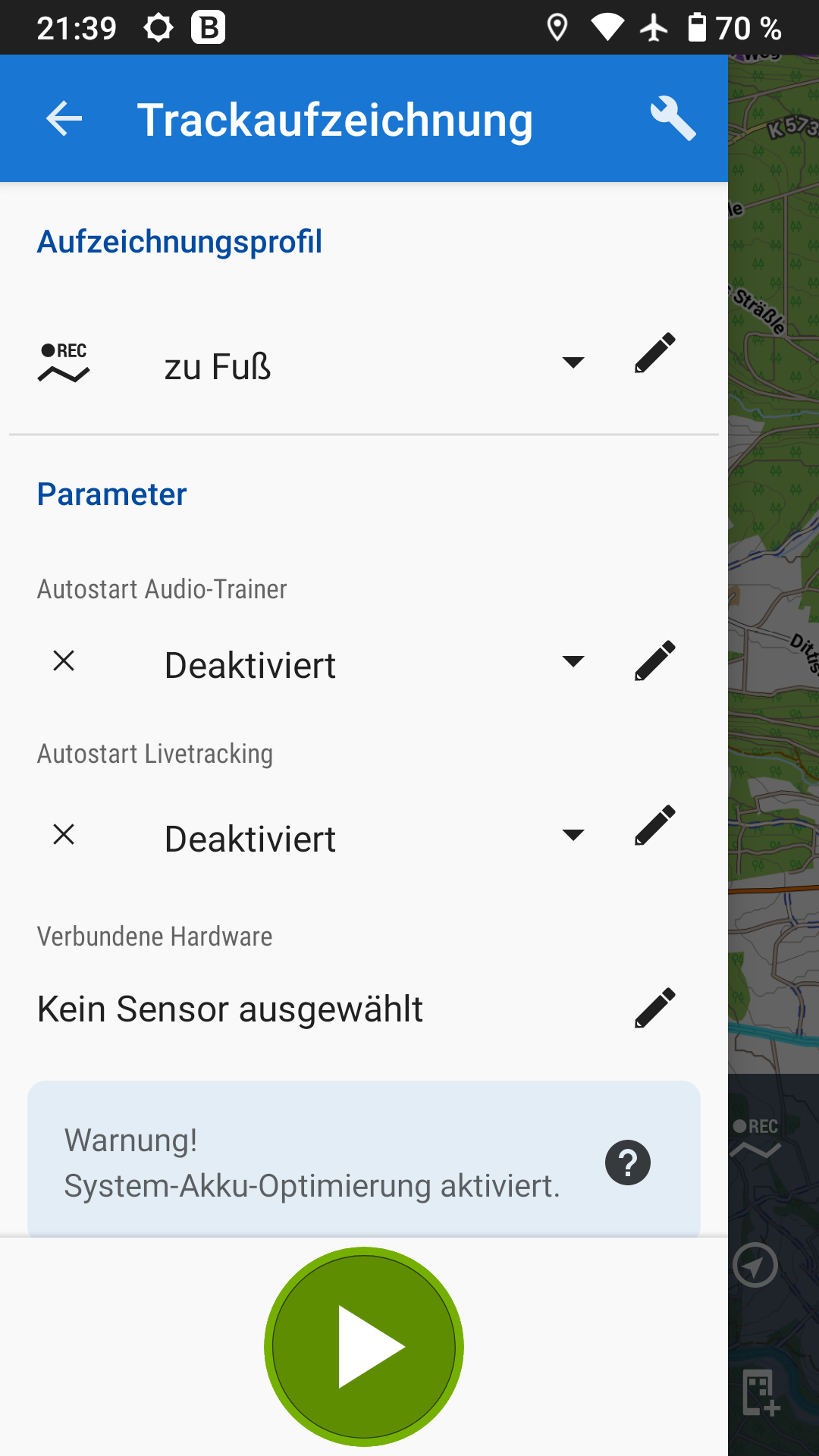 After a longer test, it seems to be true that accu optimization is turned off,, because I had no problem recording a longer track even the screen turned off. But I am not able to get rid of the hint in screenshot 1 when starting a new track.