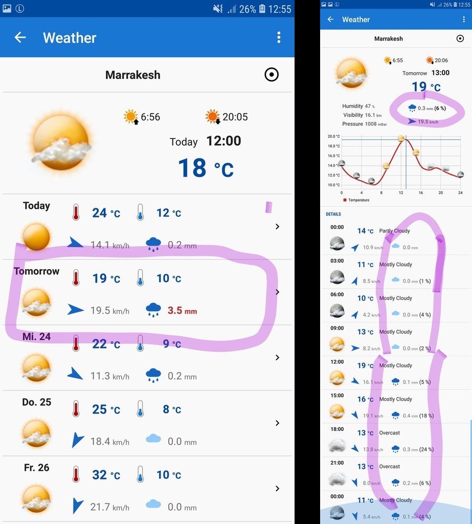 My proposal: give the rainfall with a unit including the time span, like on the daily screen in X mm/day , in the 3 hour steps either with X mm/3h (as the sum of the following three hours) or X mm/h (as the average of the following three hours). In addition a graphic representation (blue blocks per hour with the hourly rain forecast) together with the red temperature curve would be quite intuitive. The rain probability could be shown by the colour intensity of the blue rain blocks." The last piece (rain probability) is not yet shown at all, see idea https://help.locusmap.eu/topic/weather-forecast-also-show-rain-and-cloud-probability
