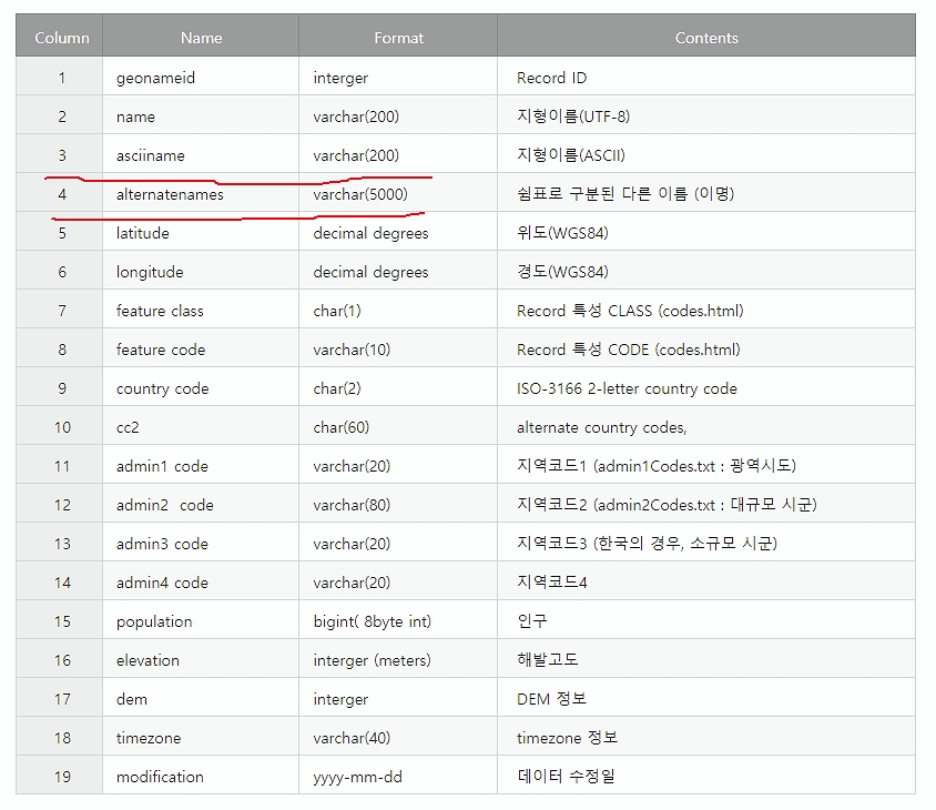 Address fields 3 and 4(asciiname, alternatenames) do not appear in the table, so please show this part