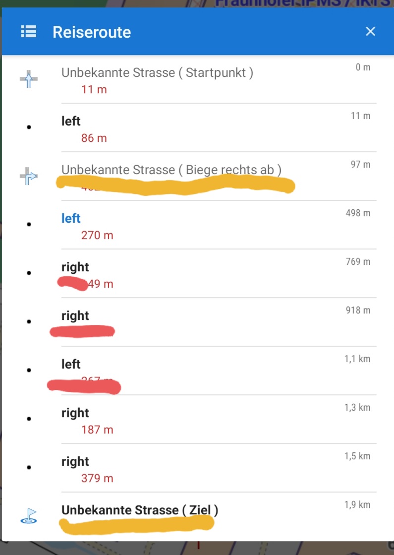 Since an update to V 3.53.0, English names have been loaded for the navigation instructions on new and recalculated routes. The list of waypoints consists of English and German instructions. As a result, instead of the turn arrows in the navigation display, the stopover symbol is always shown and the voice output is incomprehensible.