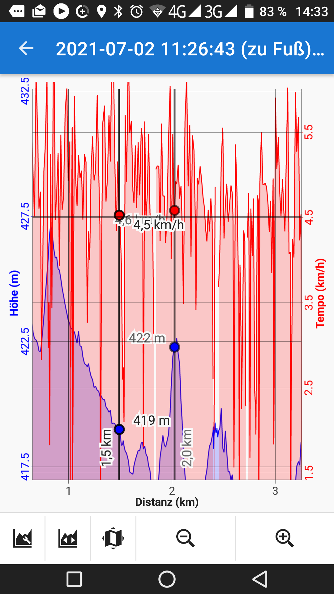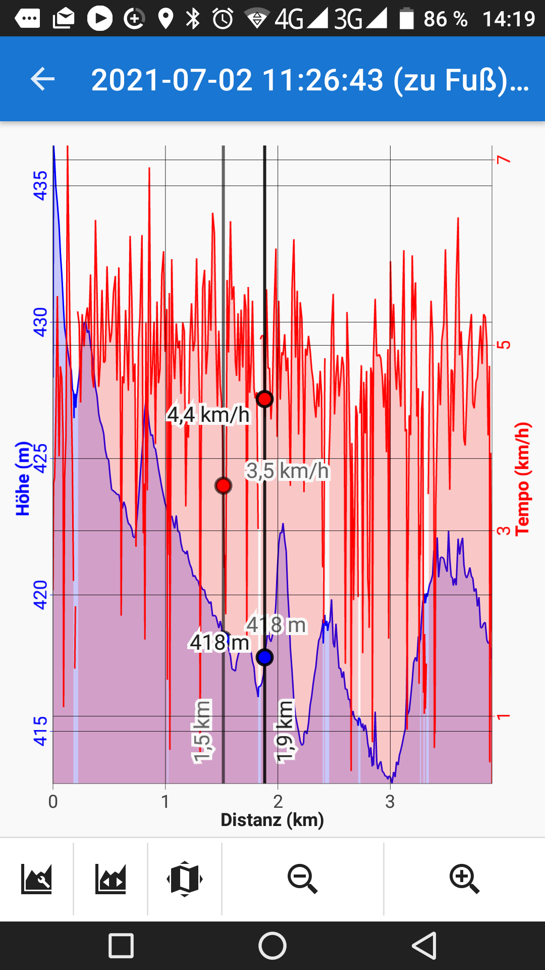 3. click on a position on the track to make the overview of a track appear with the altitude/speed graph. The selected position is shown in the graph with a black line, blue and red points with assigned values.