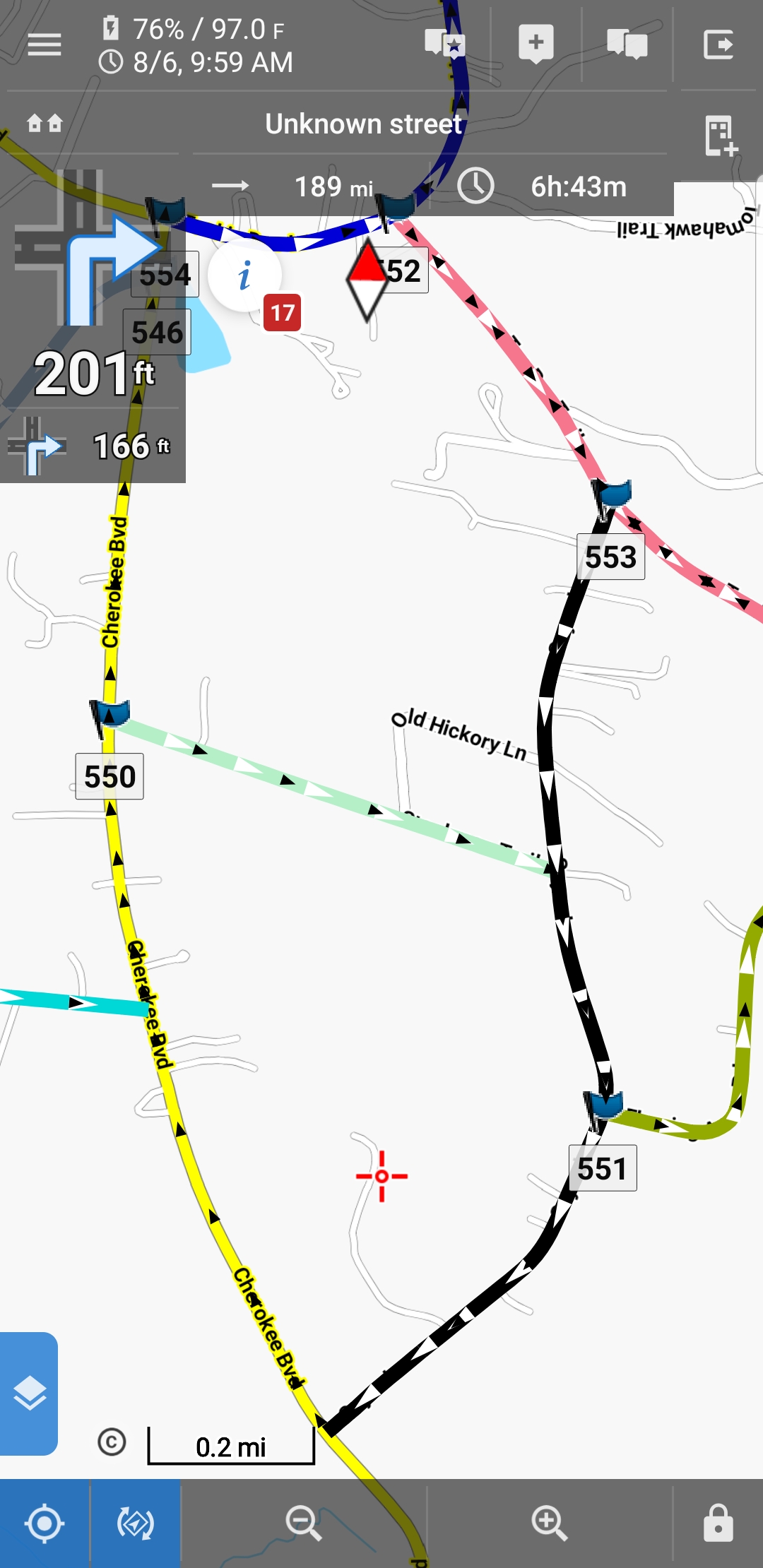 I'm providing an attachment to show what I'm talking about. I have it transparent so I can still see the direction and colors of the other tracks, but have the black arrows visible for navigation to and from the other tracks.