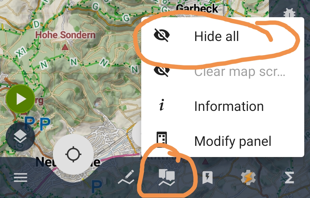 Nicht exakt wie Du es willst, aber... Langtippen siehe Anhang bekannt? Dann werden Tracks und Punkte ausgeblendet. Oben rechts sind dann Symbole womit Du Track/Punkte wieder einblenden kannst.