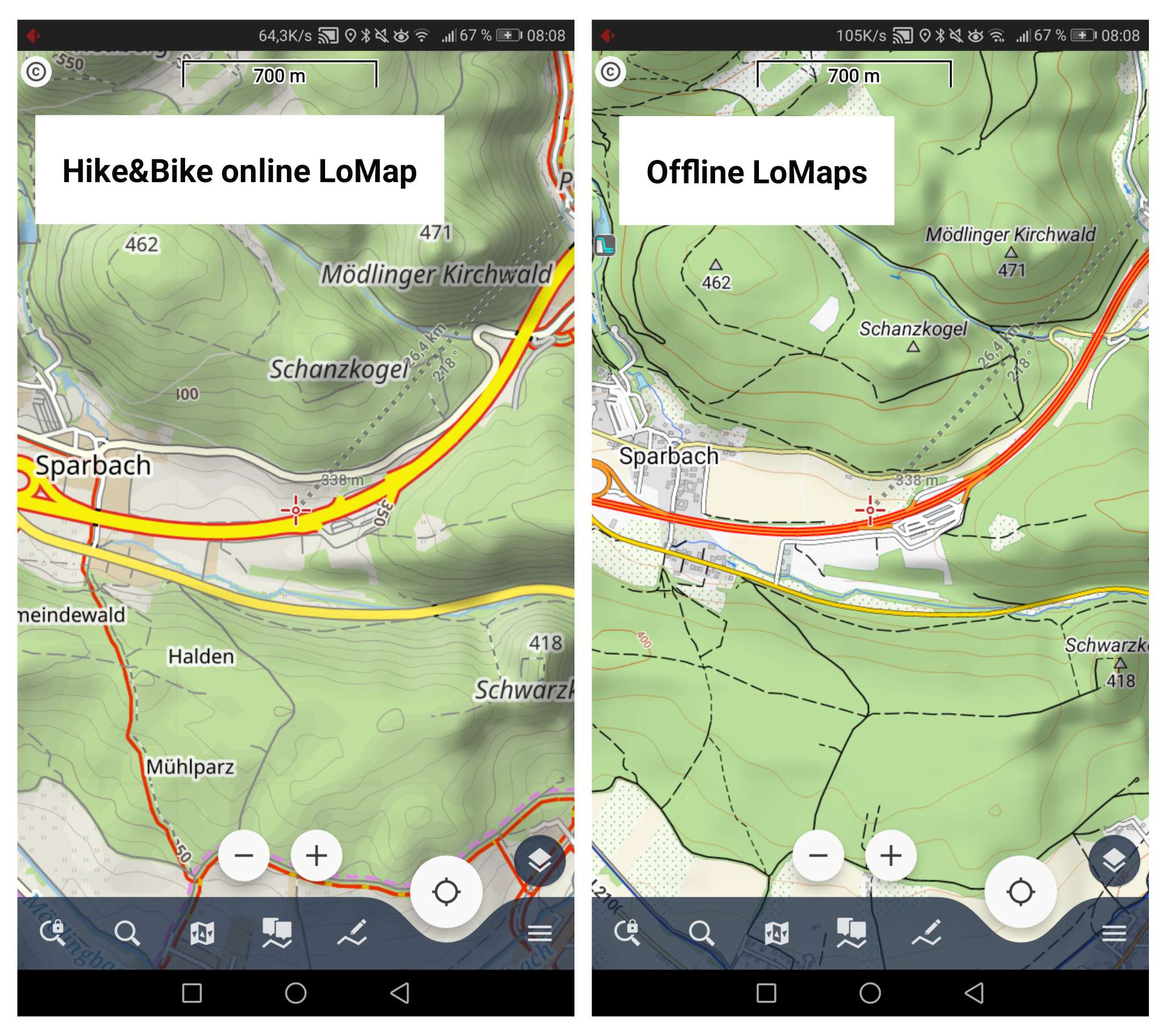 I attached 2 screenshots of the same area to demonstrate the improvements: 1) LoMaps with 20m lines based on 3" hgt-files. 2) OpenAndroMaps with 10m lines based on 1" hgt-files.