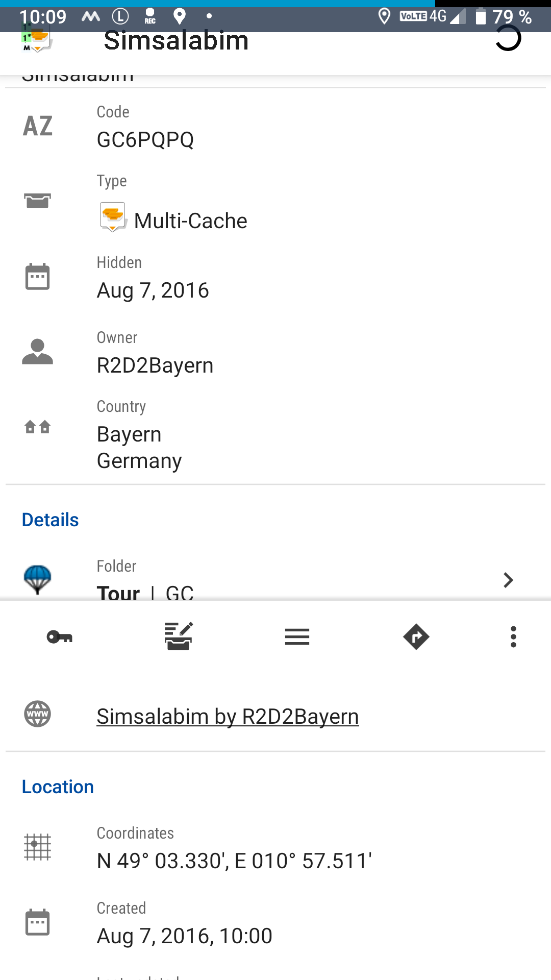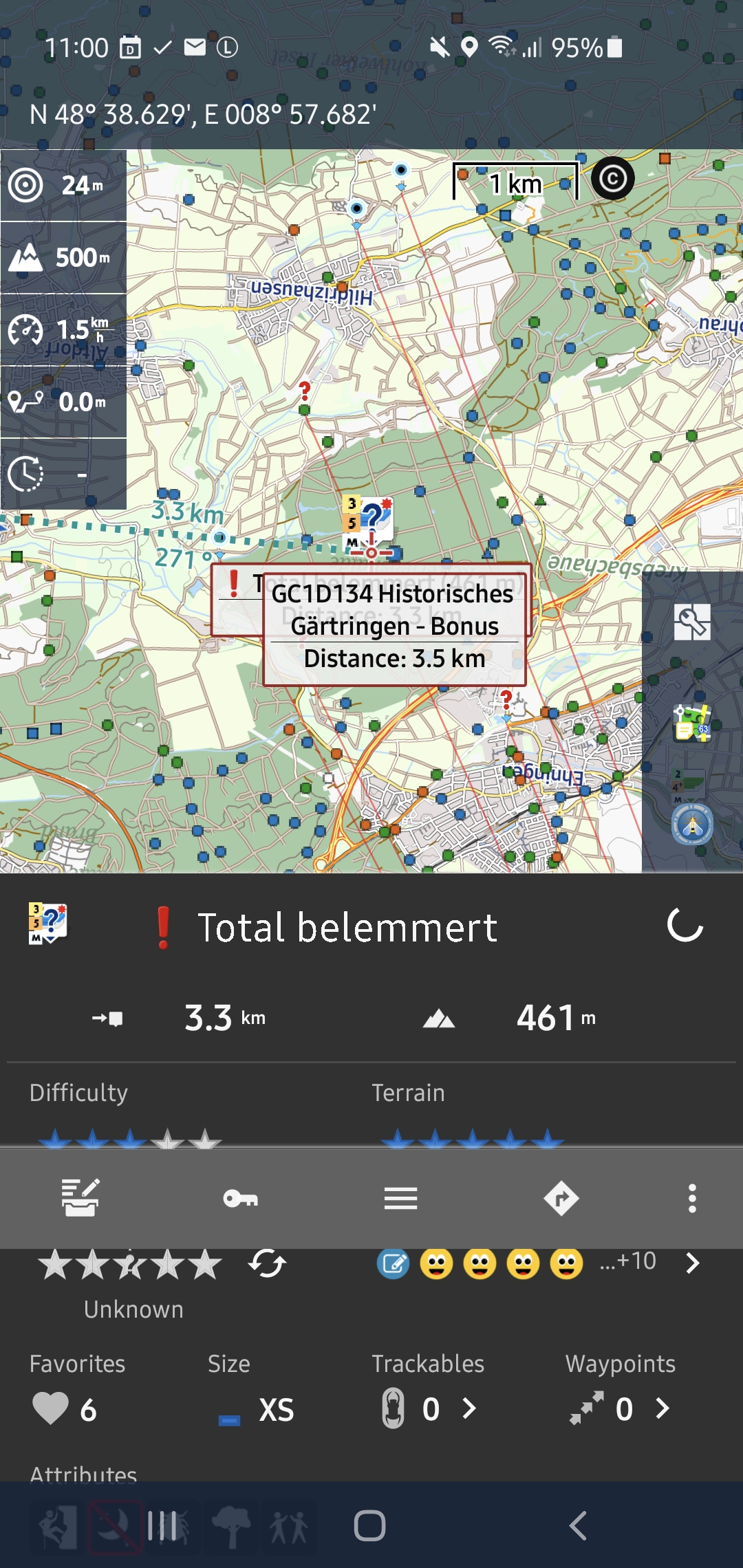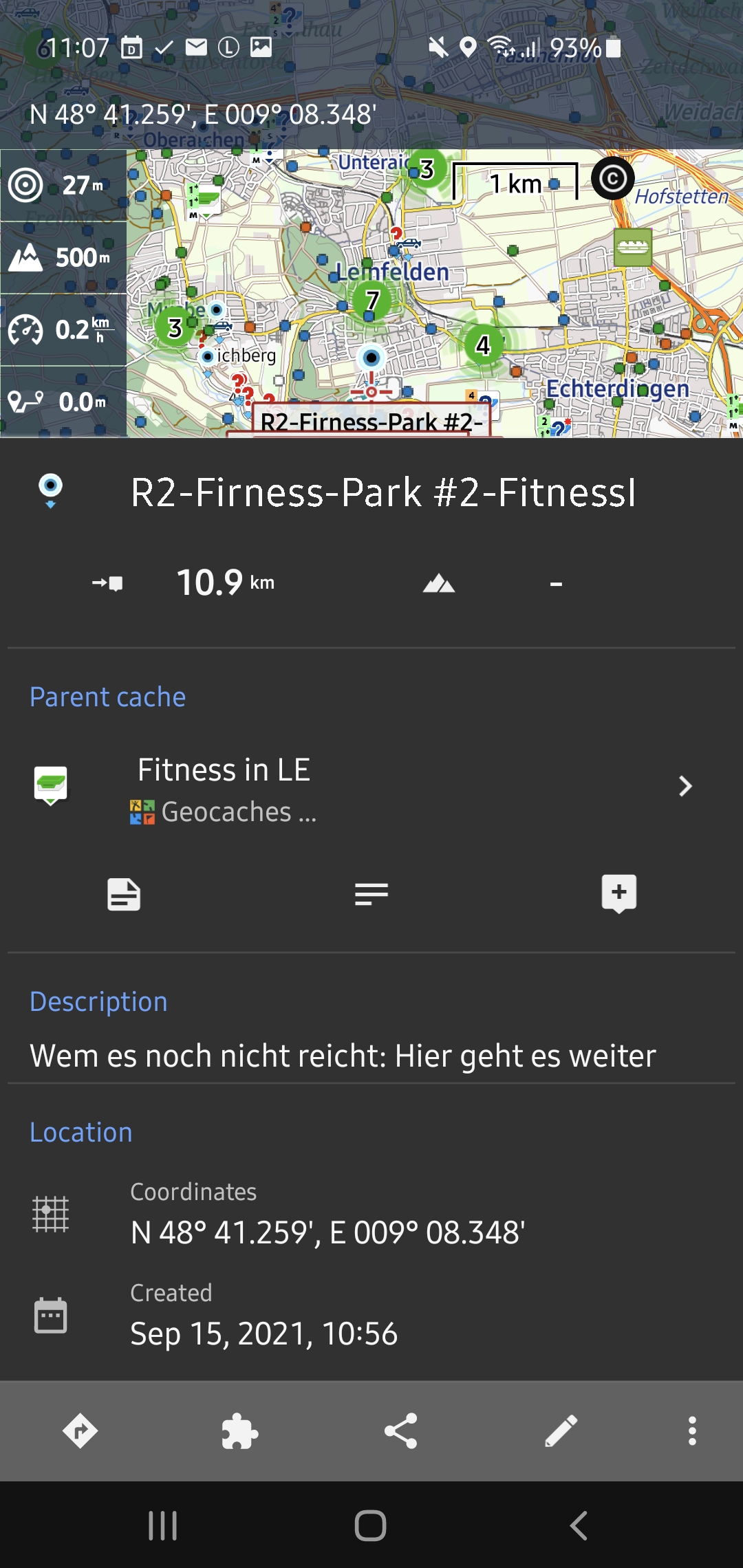 I display the map with lock to position but with turning map switched on. I saw it a few times, when selecting a Geocache on the map. Or when I the area I touched on the map contains several items and I get the choice which to display. Selecting a Geocache form this choice shows this issue. Also when selecting the waypoint of a geocache and then jumping to the parent.