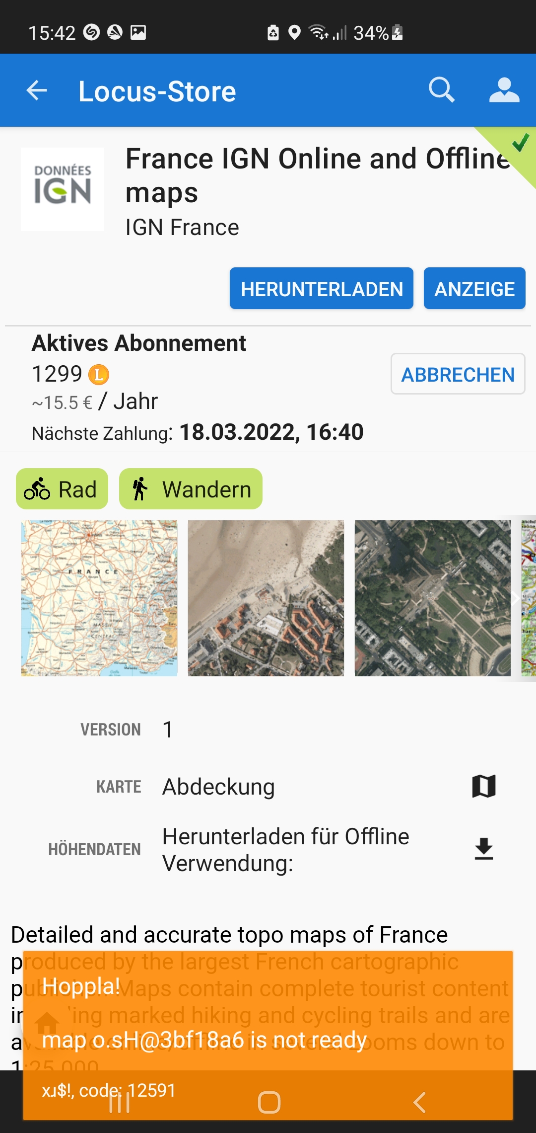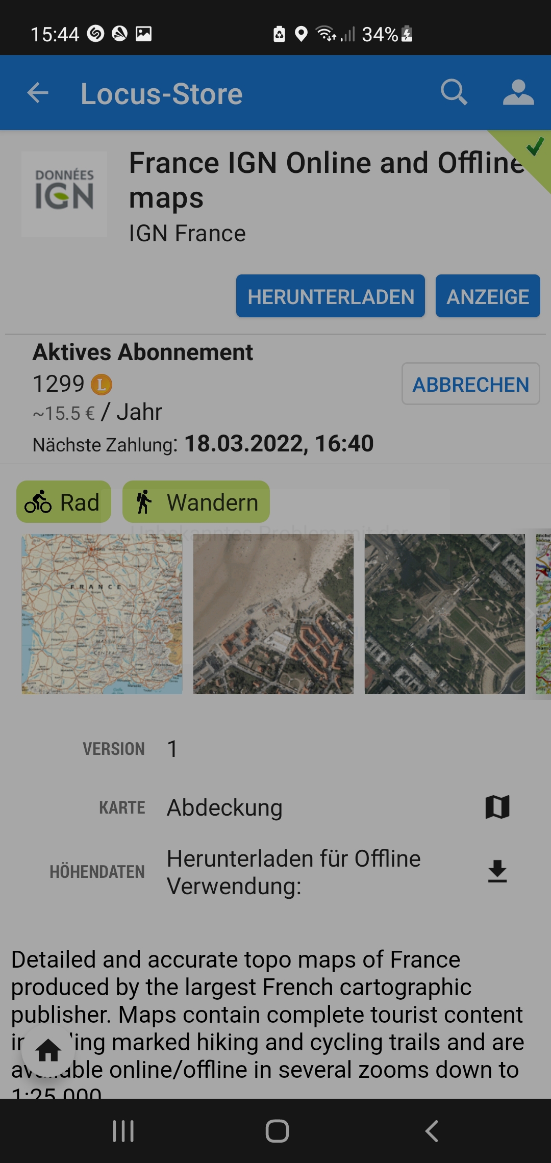 Nach dem neuesten Update finde ich meine abonnierte Frankreich-Karte im Karten-Manager nicht mehr. Ist normalerweise kein Problem. Ich wollte mir die Karte neu downloaden. Jetzt bekomme ich über den Locus-Store aber beim Versuch diese herunterzuladen die Meldung: Unbekanntes Problem mit der Karte. Anzeige geht auch nicht, hier erscheint eine Fehlermeldung. Wie komme ich wieder an meine abonnierte Frankreich IGN Karte ? Vielen Dank. MFG Udo Filz