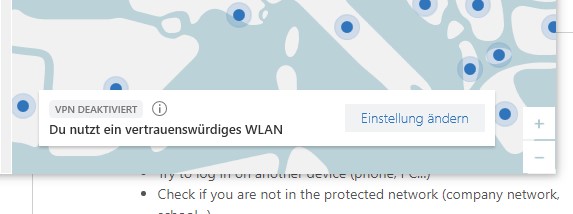 Es ist mein "Nord-VPN". Wenn ich es nicht mit Windows lade, kann ich mich anmelden. Wenn es geladen ist und trotz der Einstellung (siehe oben) "vertrauenswürdigem (WLan)Netz", wird der Locus-Webplaner blockiert. Ich weiß nicht warum, denn alle anderen Anwendungen die ich "online" nutze, funktionieren.