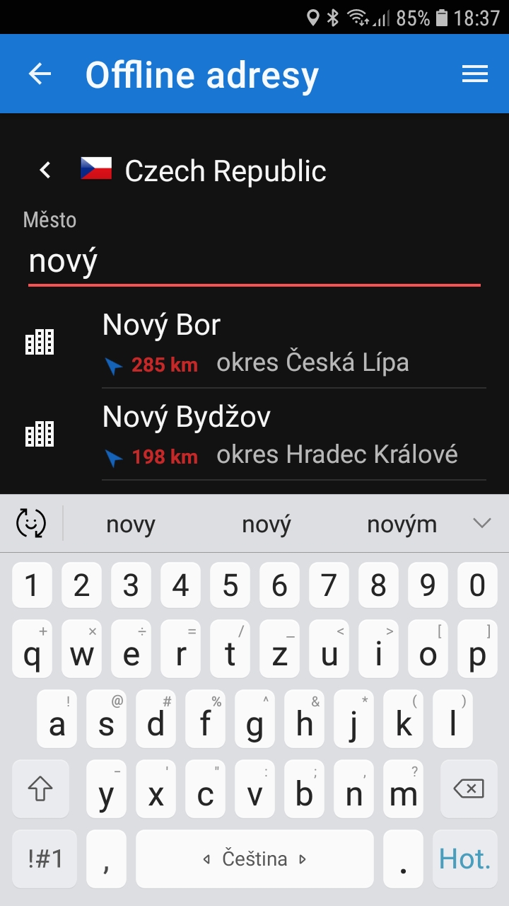 Narazil jsem na takovou nepříjemnost s vyhledáváním. Podotýkám, že se to týká je offline vyhledávání adres. U online je vše v pořádku. Vyzkoušeno na Samsung s A8 a tabletu s A11, klávesnice Samsung.