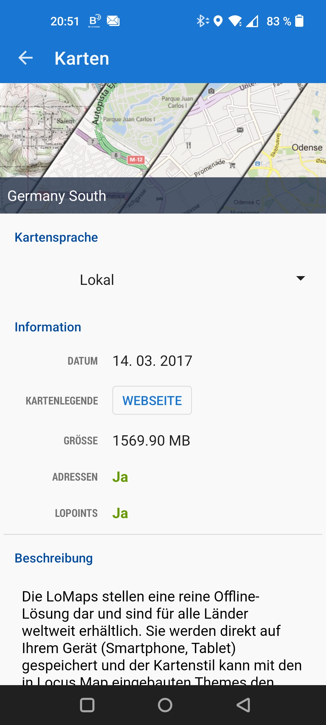 I’m using for example the offline map LoMaps Germany South with date 14.03.2017.