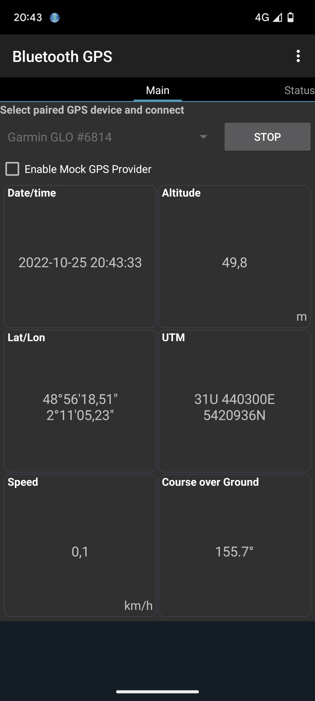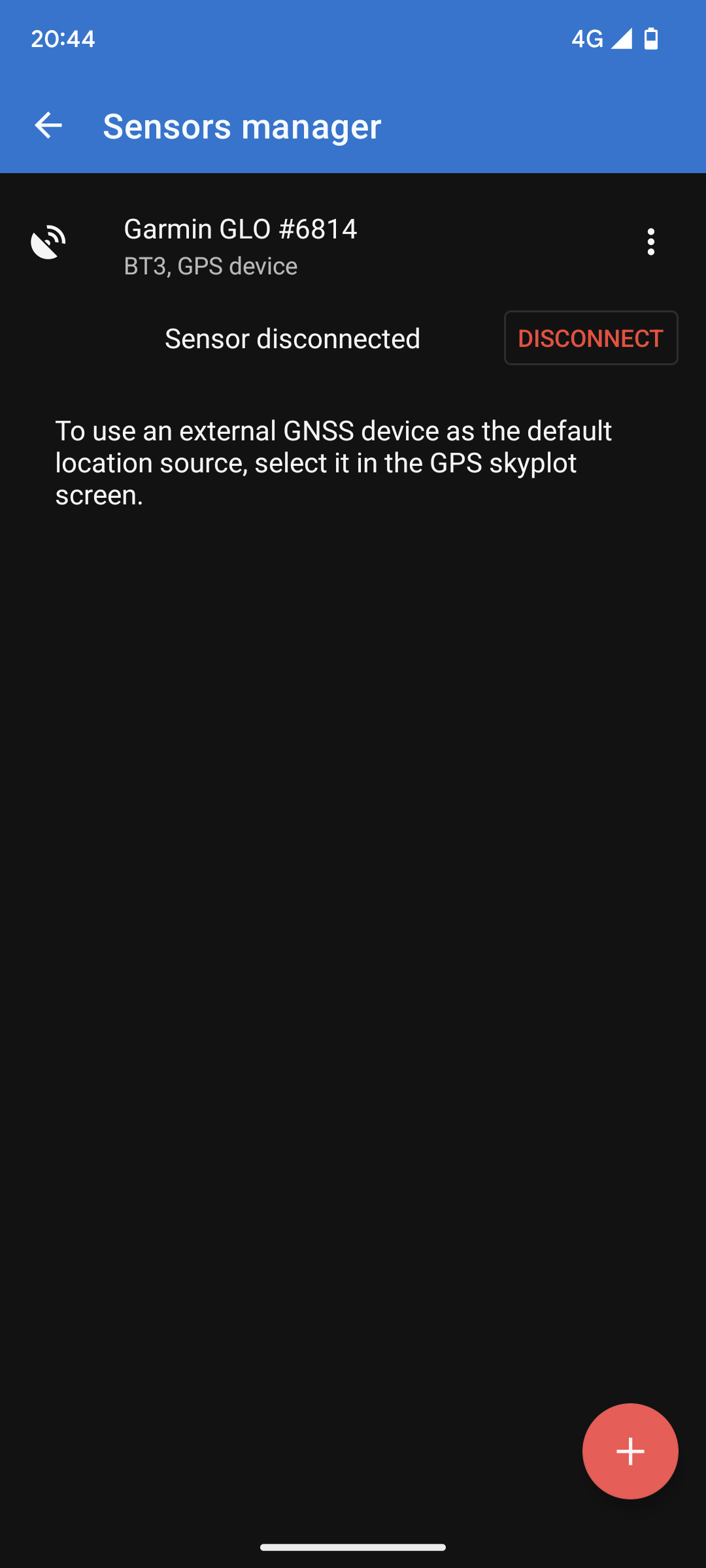 As promised, here are two screenshots: one with the Bluetooth GPS app properly connecting to the Garmin GLO, and one with Locus showing the external GPS as disconnected (and the GLO LED confirms the BT connection is not established).