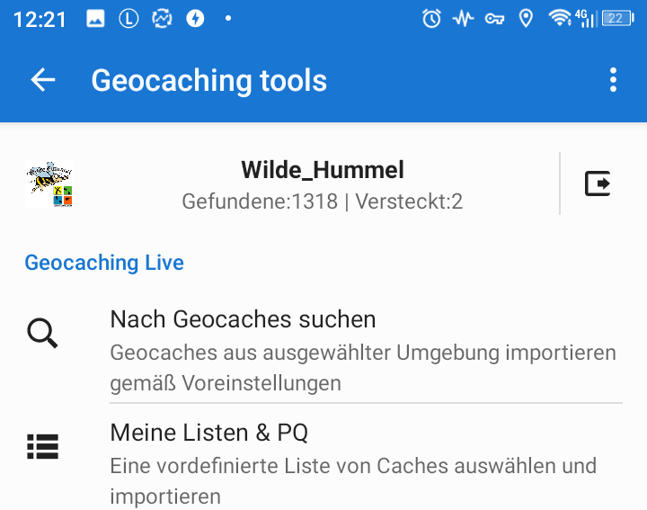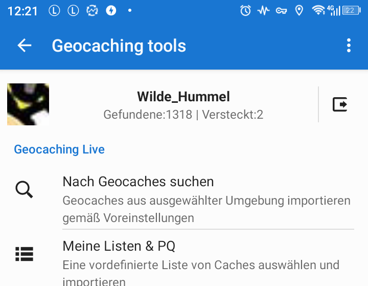 Seit einiger Zeit kann man ja die Geocaching PQ direkt aus Locus laden. Weil ich angemeldet bin, sehe ich ja mein Geocaching Logo oben links. Das wird jedoch nicht richtig "eingepasst". Erst nach erneutem ab- und anmelden stimmt es wieder. Siehe Screenshots.