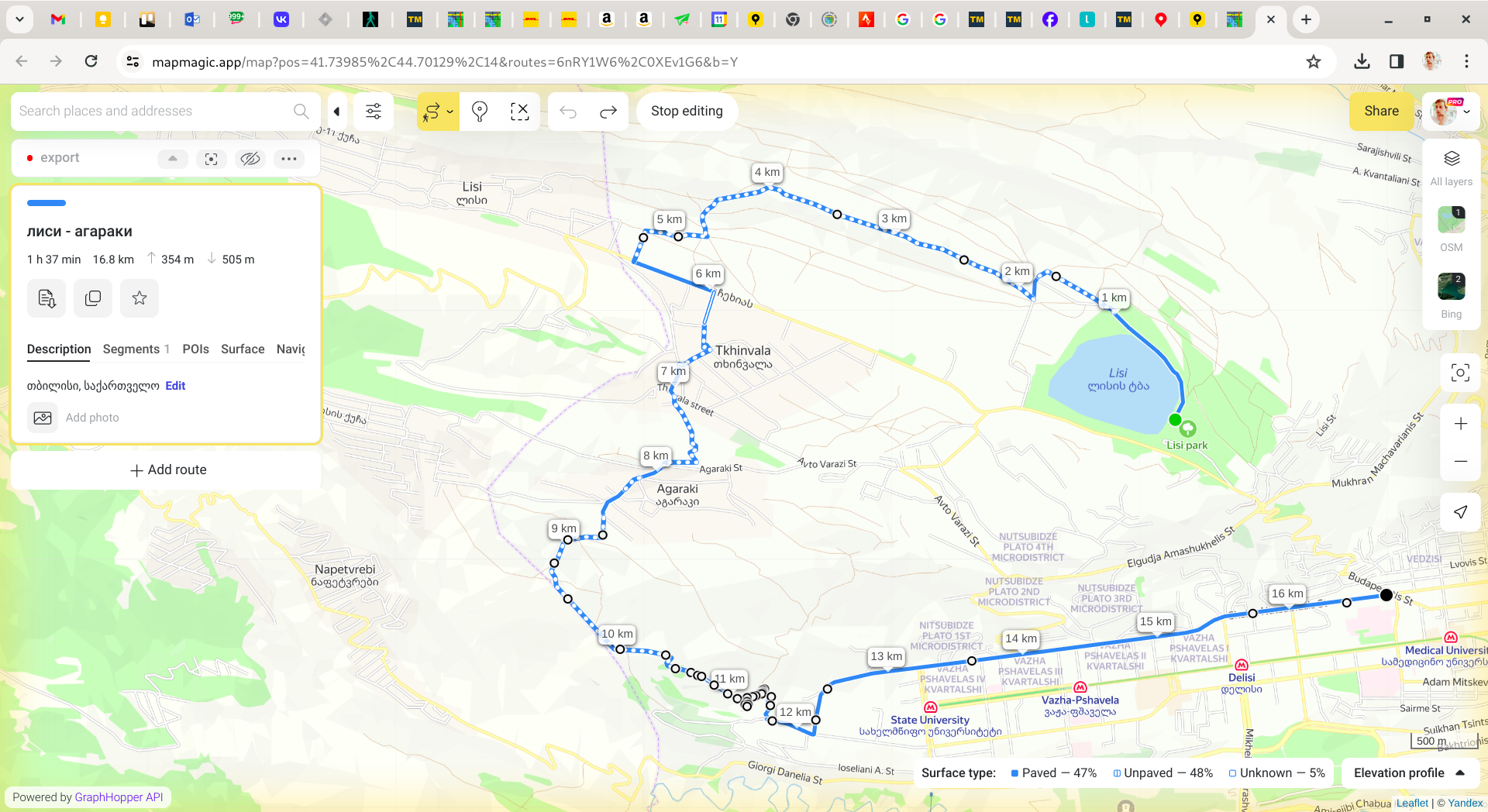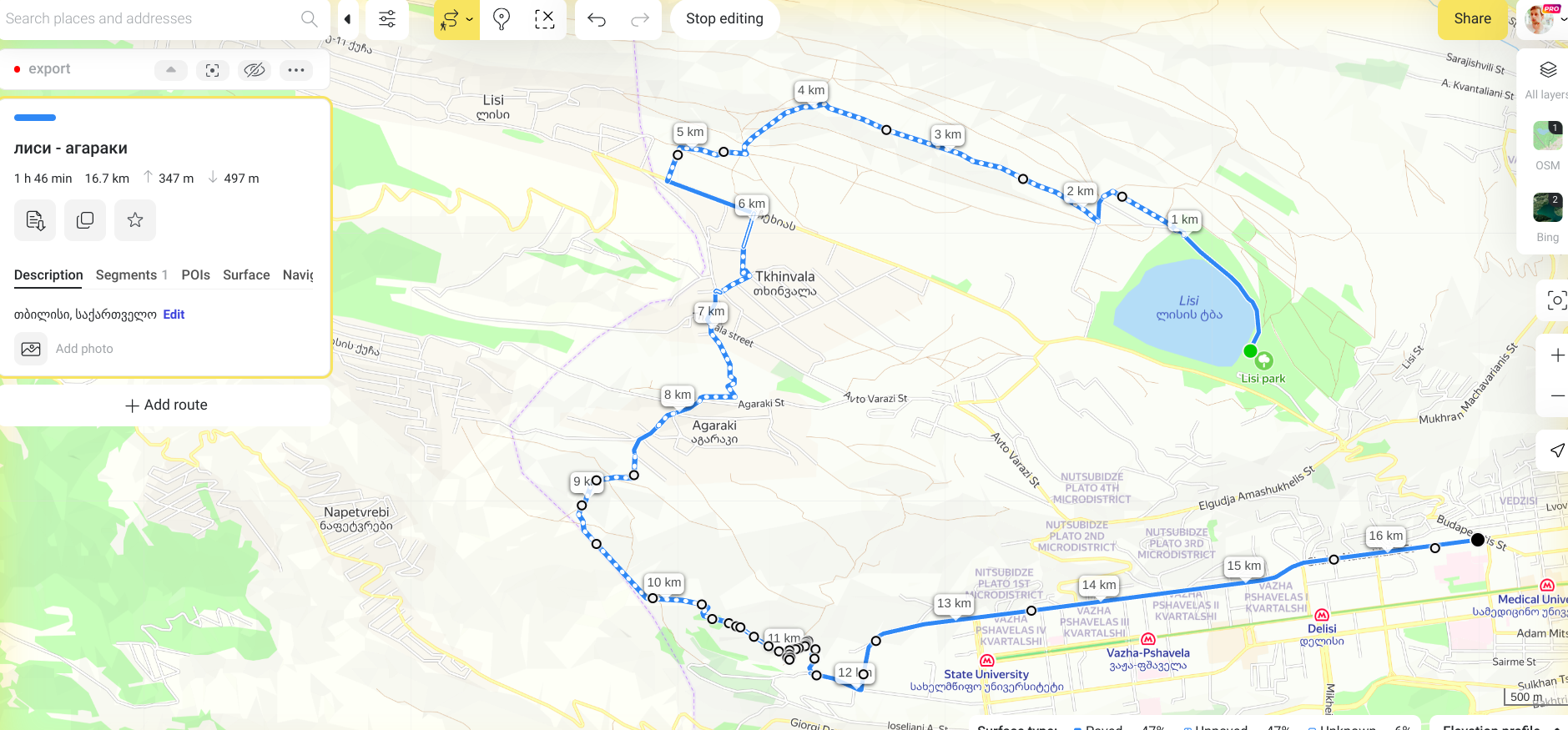 The same true for other apps, like strava. Sometimes there is only 3 points for whole route, and it's impossible to edit it - If one of the points moved, half of route is rerouted.