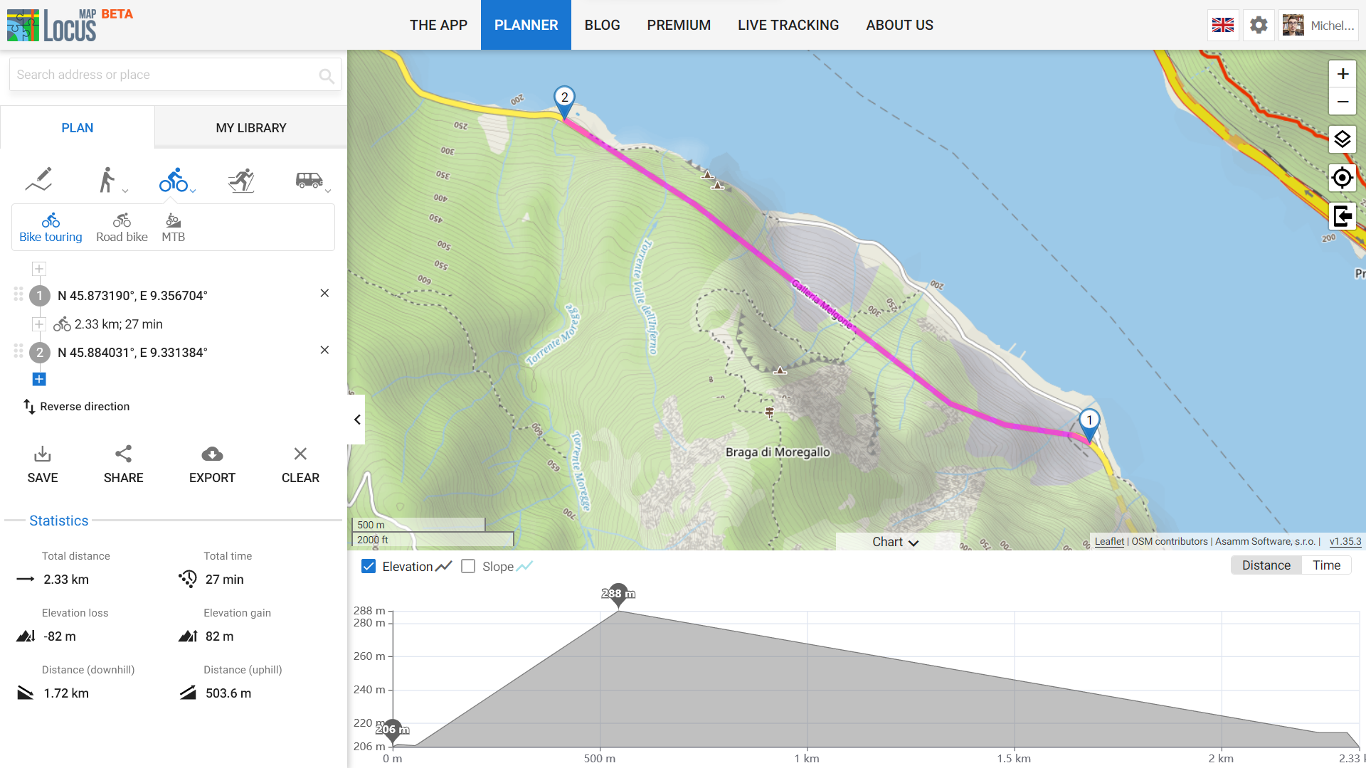Locus Map 3: -1348 m loss / +1328 m gain (= wrong because elevations of mountain above is used)