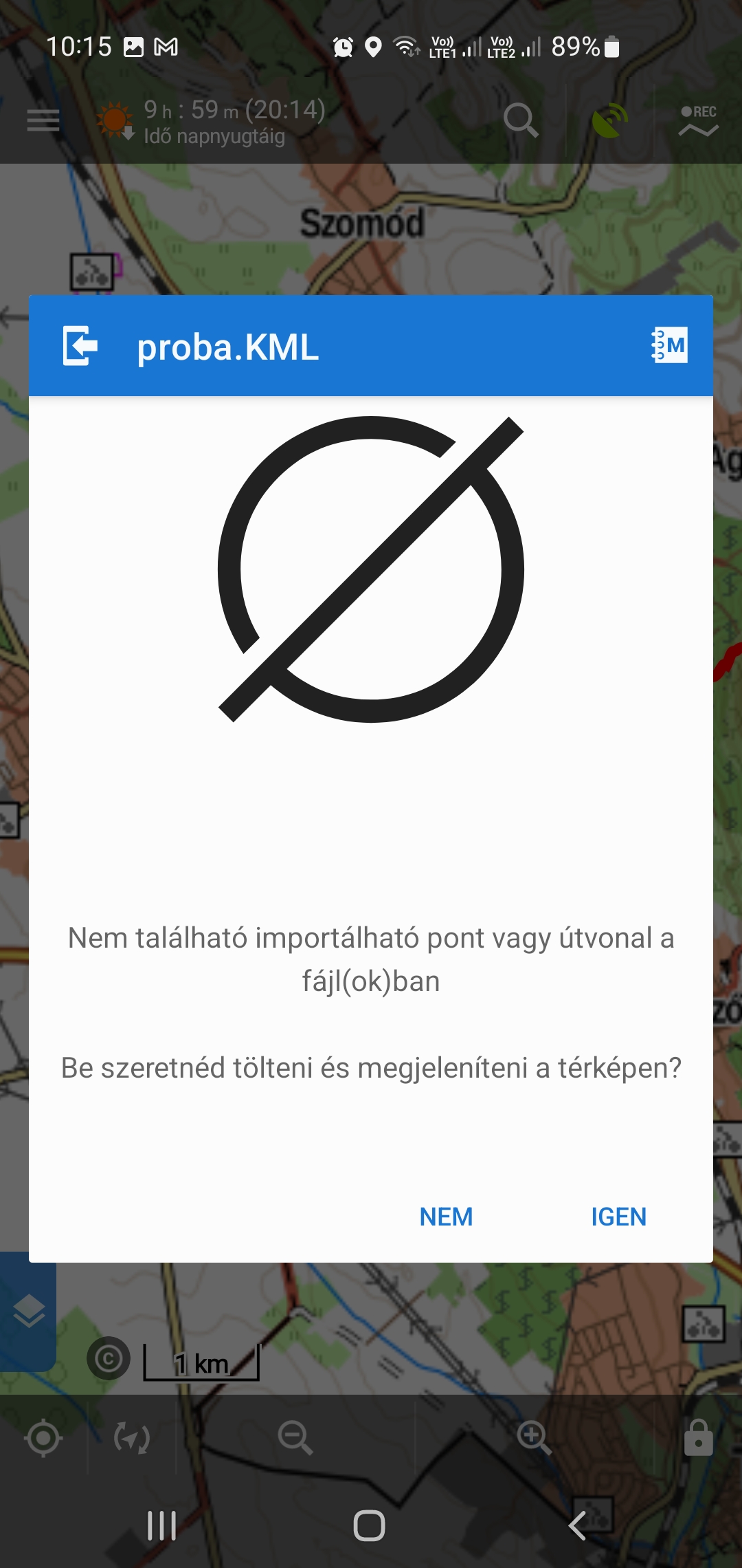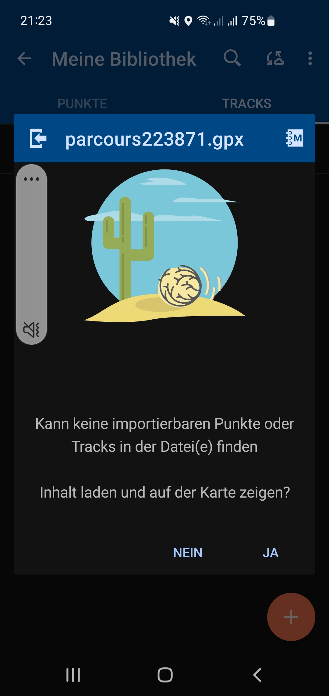 Hi, I use the app on my Samsung Galaxy S10 sind 2020 and I had never any problem. But now suddenly I cannot import anymore any tracks. I have read that I should give the files other names in case the have _ or ä or something like this, but it doesn´t work. I attach a screenshot so that you can see that I receive exactly the same error message as Attila described. It says cannot find importable points or tracks in the file and asks if I want to show it on the map. If I chose "ja" I come back to the map but without any track ....