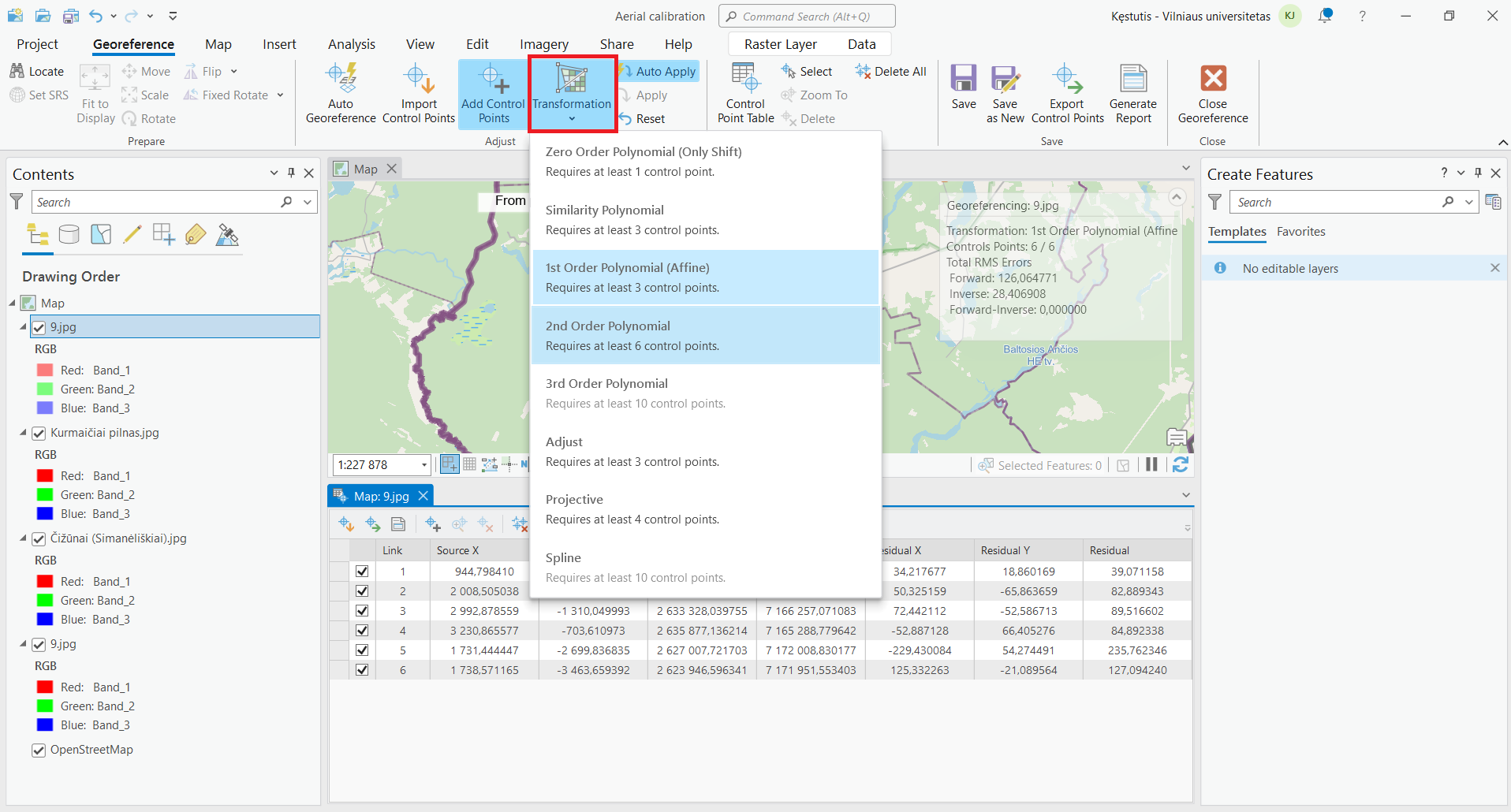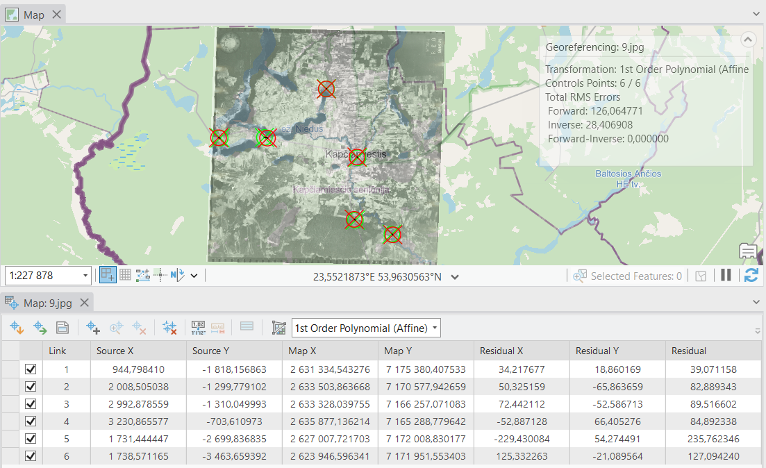 For example: Image "1" shows an aerial image calibration on ArcGIS Pro with marked 6 control points - they were placed correctly and all of them brings terrible offset (one of the points - more than 200m). This is due to specific angle, from which the aerial was taken.