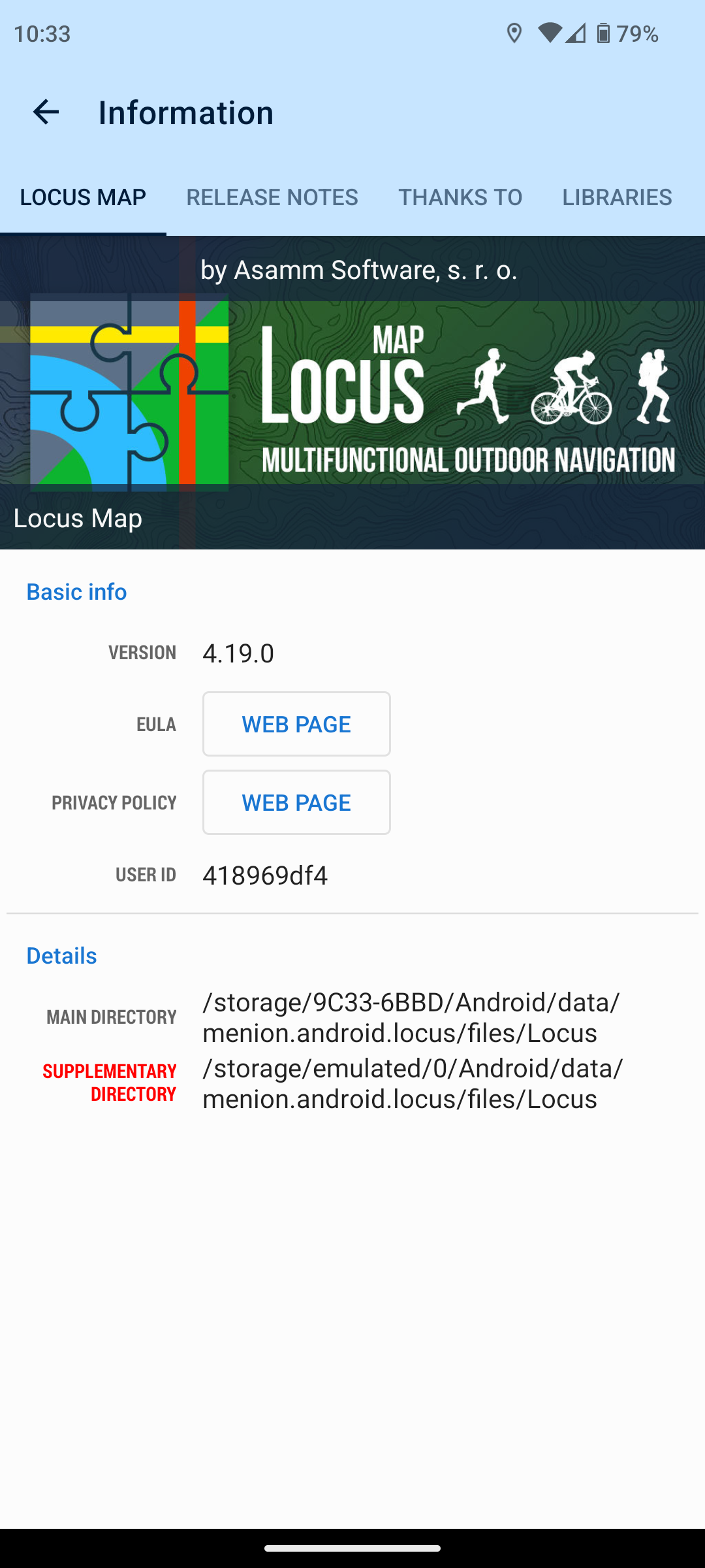 Richard, sorry, my mistake, the detailed app info is displayed after long-tapping the "helpdesk/about app" button, not the main menu... Nevertheless, in this case, your second screenshot will do, thanks. I can see Locus Map storage placing is standard.