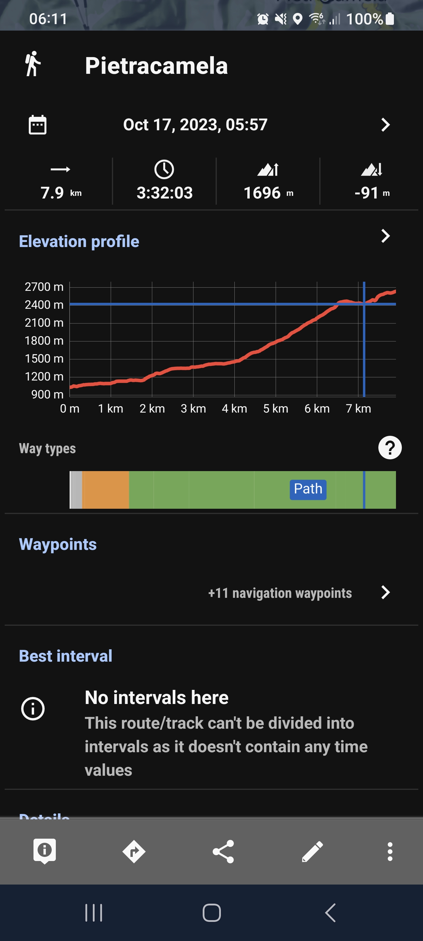 Once I have created the track and decided to save it, I click on my route, and all the data are there except for the information about the best interval. I see this message: "this route/track can't be divided into intervals as it doesn't contain any time values."