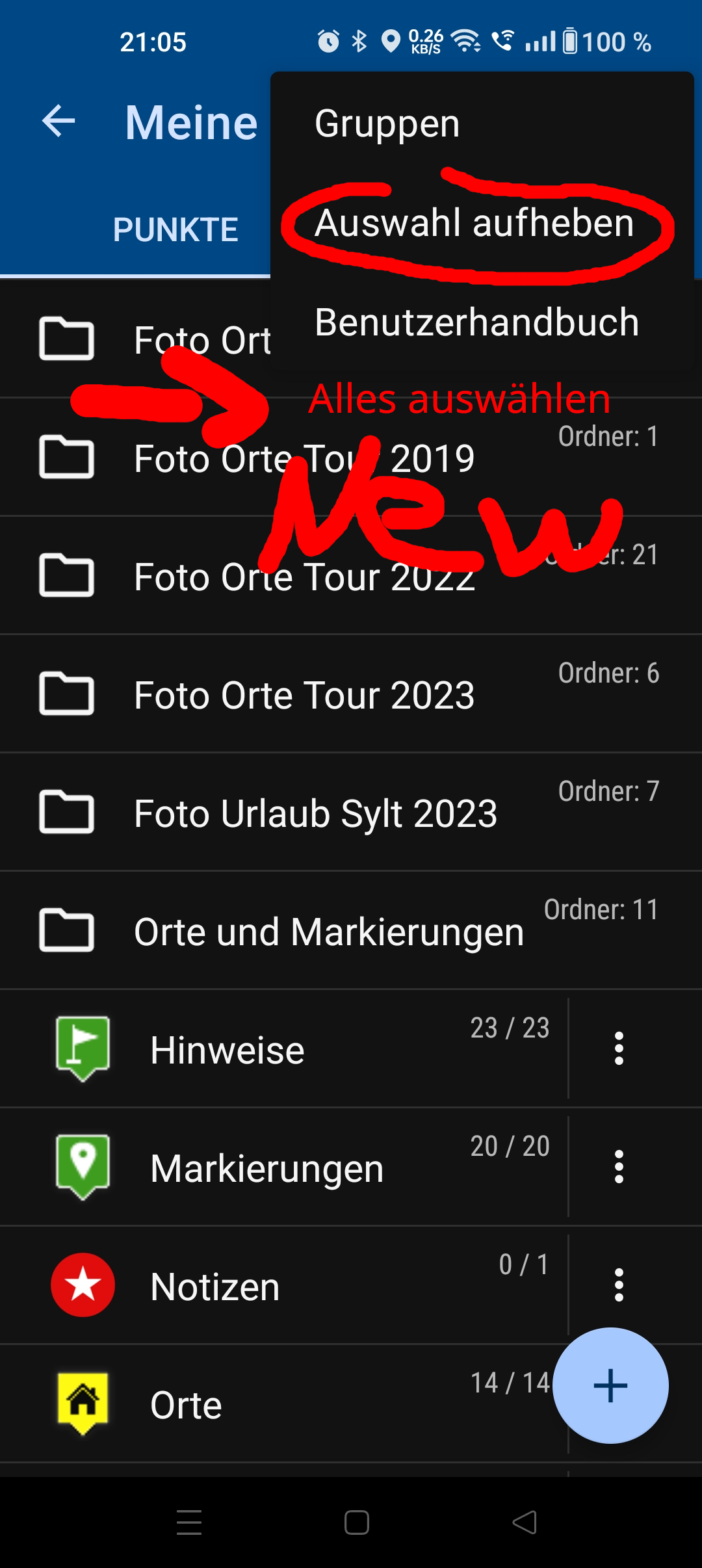 In der POIs Übersicht gibt es die Option »Auswahl aufheben« aber mir fehlt die Möglichkeit »Alles Auswählen«. Wenn man jedesmal in den einzelnen POI-Ordner gehen muss um alles auszuwählen, dann artet es bei sehr vielen POI-Ordner in Arbeit aus und ist nicht konfortabel.