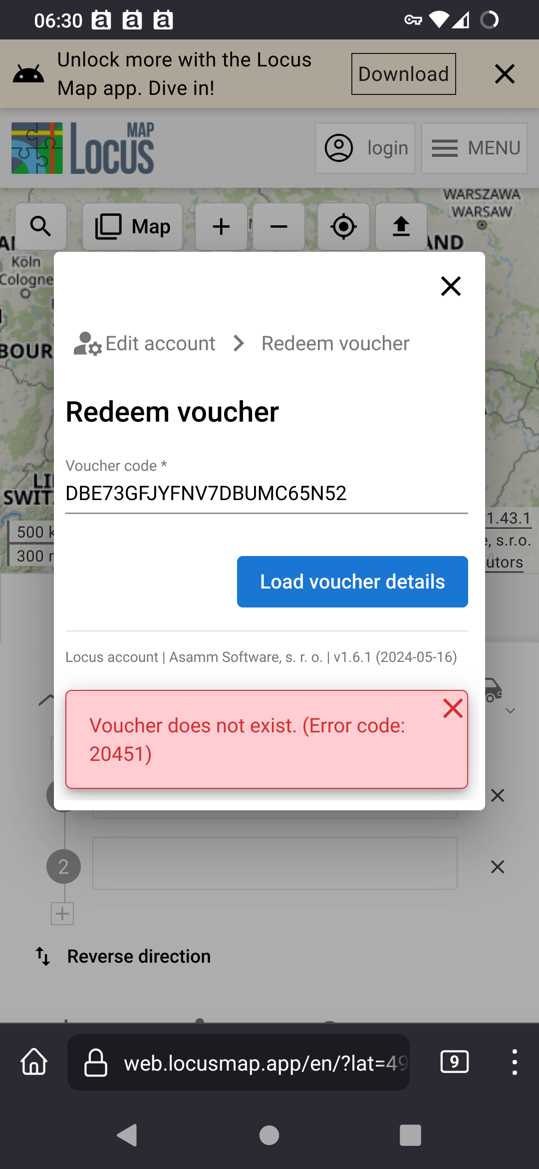 I cannot redeem the voucher in neither the locus app or on locusmap web. See attachment for error code. I mentioned this to menion a 2 weeks ago, but no solution. Im sure he is busy, but maybe this is connected to the sync issue.