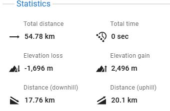 Hi. When planning a new track, the application estimates the total time needed to complete the track (cf. screenshot1.JPG). Once the track is saved and reloaded, the total time is not shown anymore (cf. screenshot2.JPG). Also other statistics change (I have reported this bug already in another topic). Best, Alex