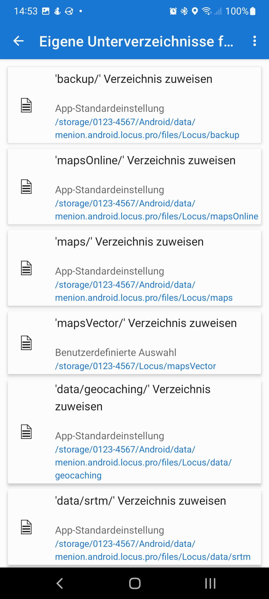 - open Locus settings > Miscellaneous > Default directories > Set custom subdirectories - send a screenshot