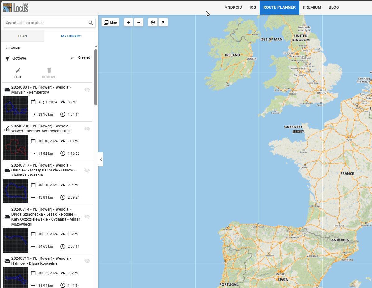 I was using a free version of LocusMap and decided to go PremiumGold for a trial to gain a single place for all my rides and recorded tracks. I've uploaded my historical rides to the tracks area... over 200 pcs. The mobile app works fine, I can hide, unhide, sort, filter and search options. Unfortunately, the web version Locus Map Web is able to display only about 20 tracks, for next portion you need press a button, and the list is not having search/filter/sort. That is really useless. I really think that working with a list of hundreds of tracks on a mobile phone with few inches diagonal is far from being productive. If you compare that to the capabilities of free version of RideWithGPS, that is a huge difference. Another nice thing from RideWithGPS are the Collections - groupers of selected tracks that are sherable as one unit. Tracks added to collections are not copies, they are just references. This is the second feature that makes me cancel the trial of Locus Gold.