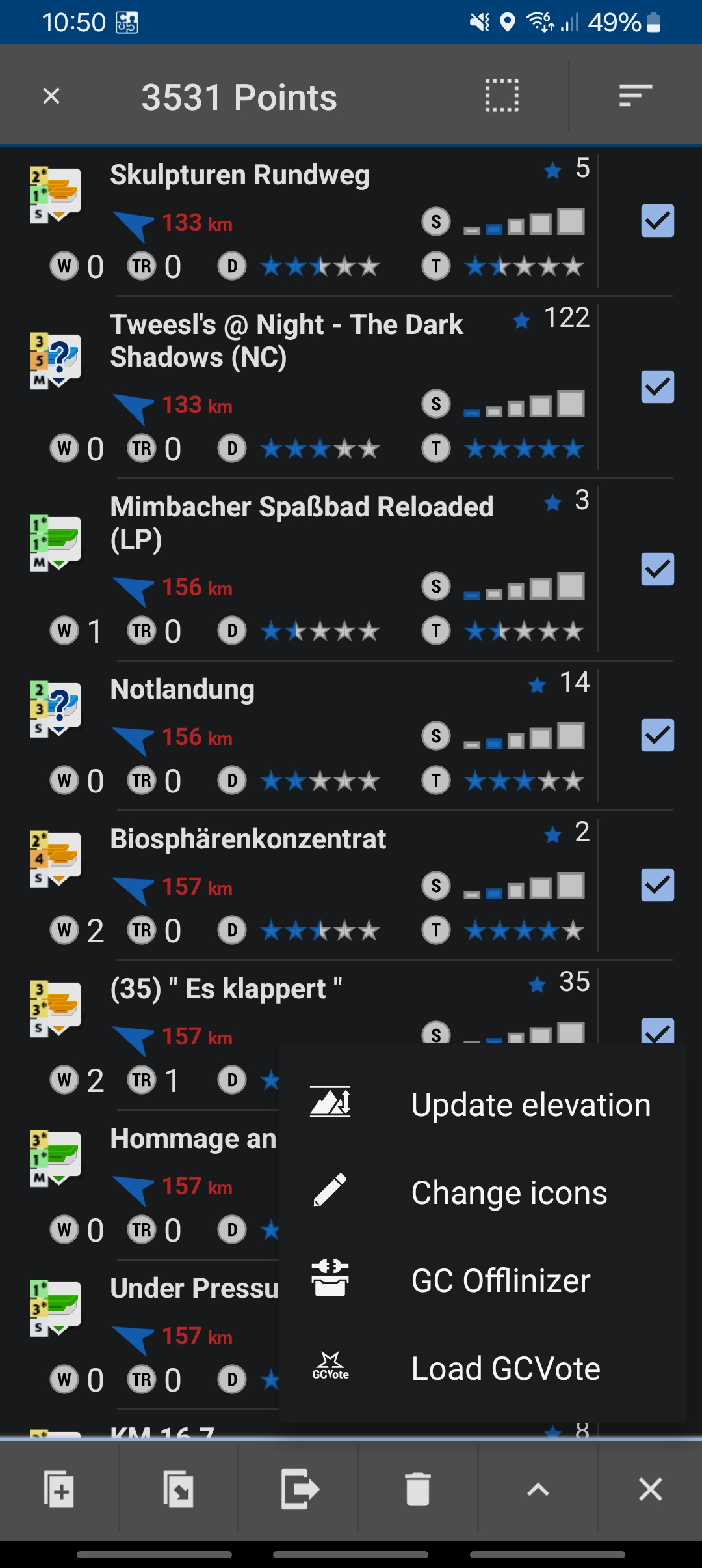 open folder with geocaches > view all > screwdriver > arrow up > update caches