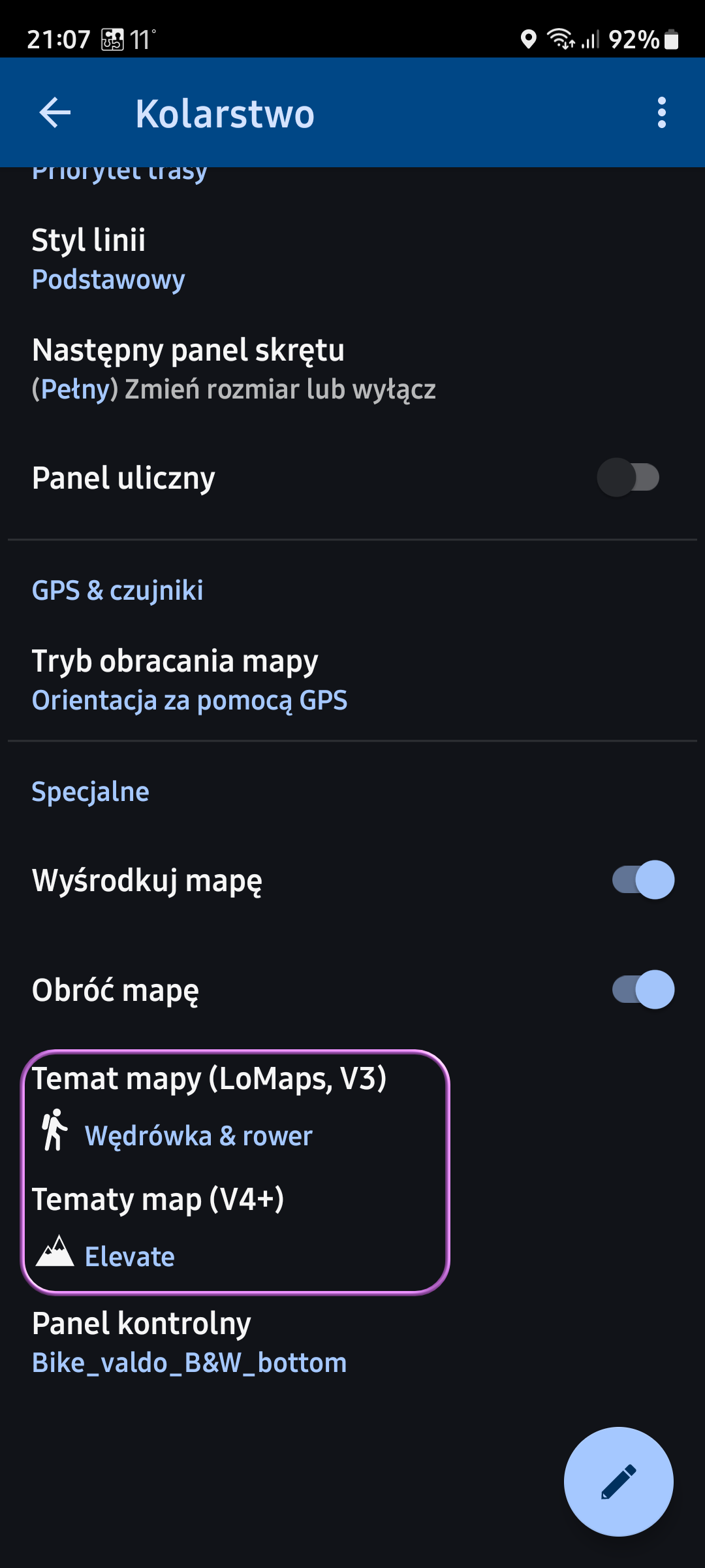 1. In the settings for the Cycling [pol. Kolarstwo] profile (Pict_01) there is an item: Map themes (V4+), to which I can add the Elevate theme (but strangely it does not see Elevate Cycling).