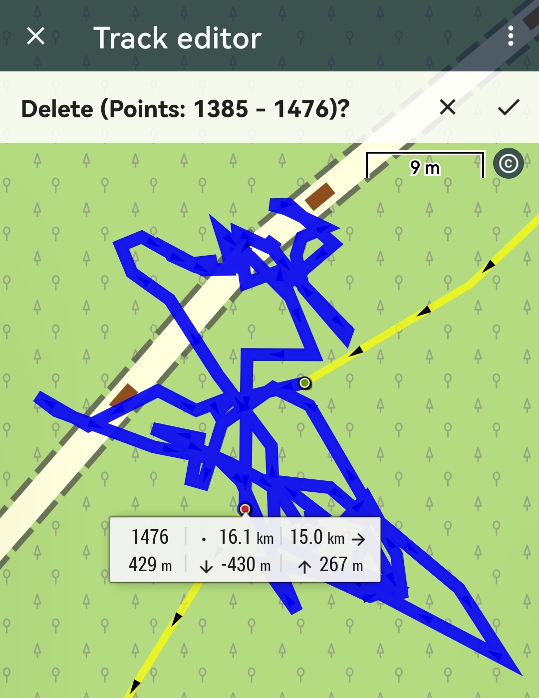 Edit track, Cut inner part - and leave a Waypoint with time delta