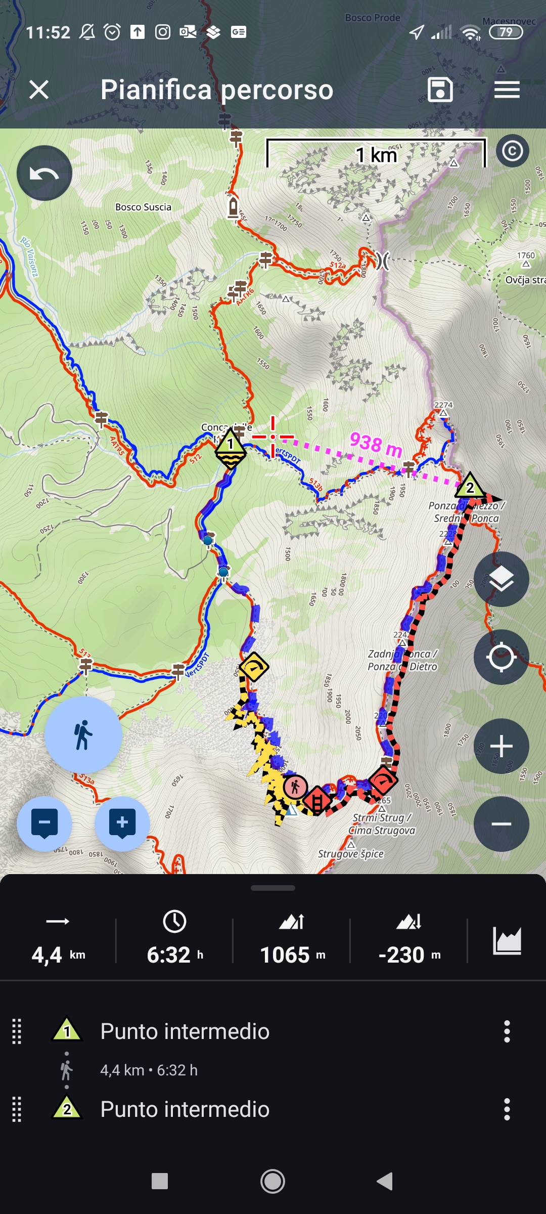 If I try to go from point 1 to point 2 (see attached figure) or select whichever point on the path 513b from Rifugio Zacchi to Ponza di Mezzo the system does not recognize the path and makes the weird path in the attached image. For reference here are the coordinates of the Rifugio Zacchi (N 46° 27.552', E 013° 41.061').