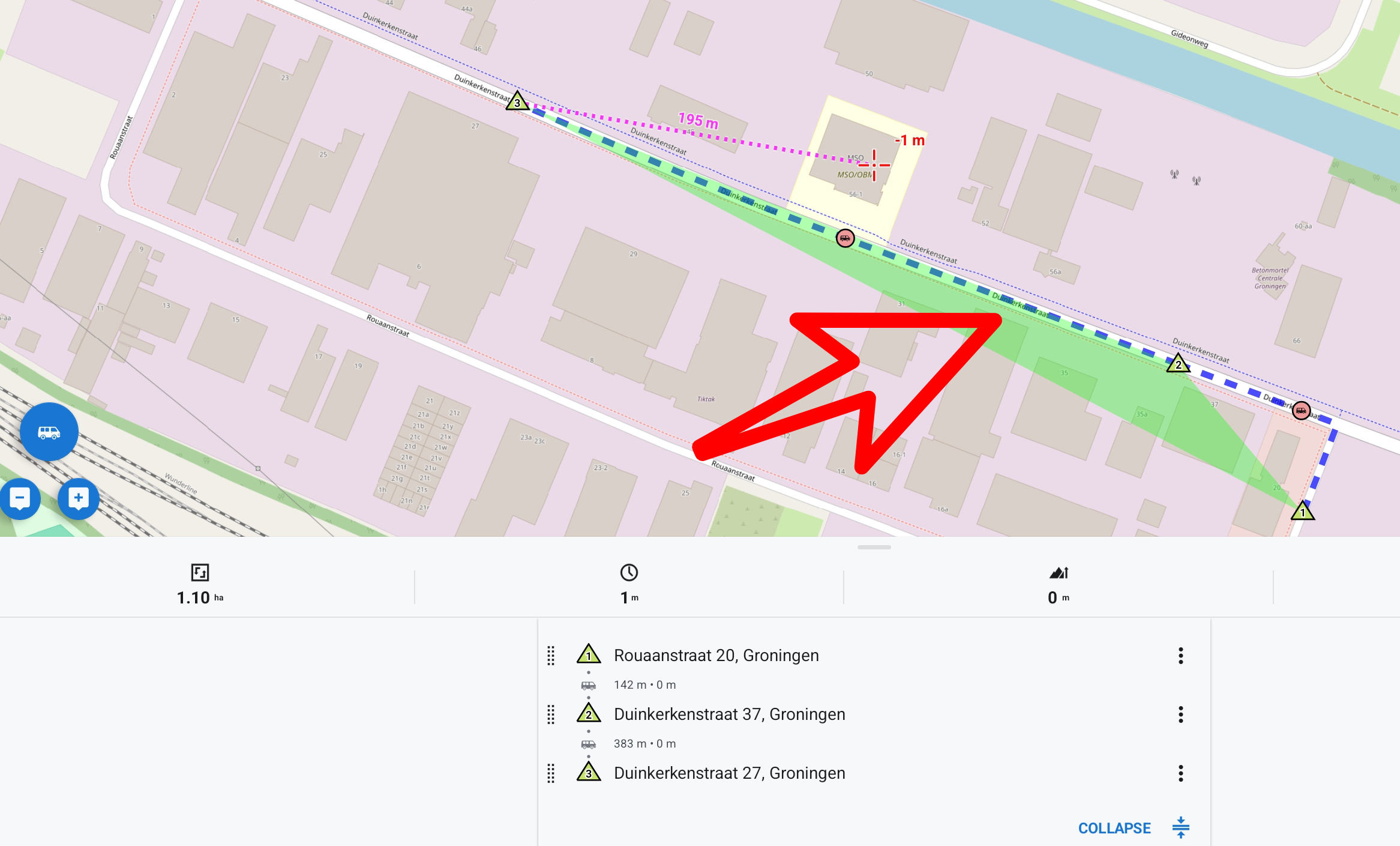 You can quickly swap between length measurement and area measurement by tapping the route length in the planner. The green area covers the measured area: