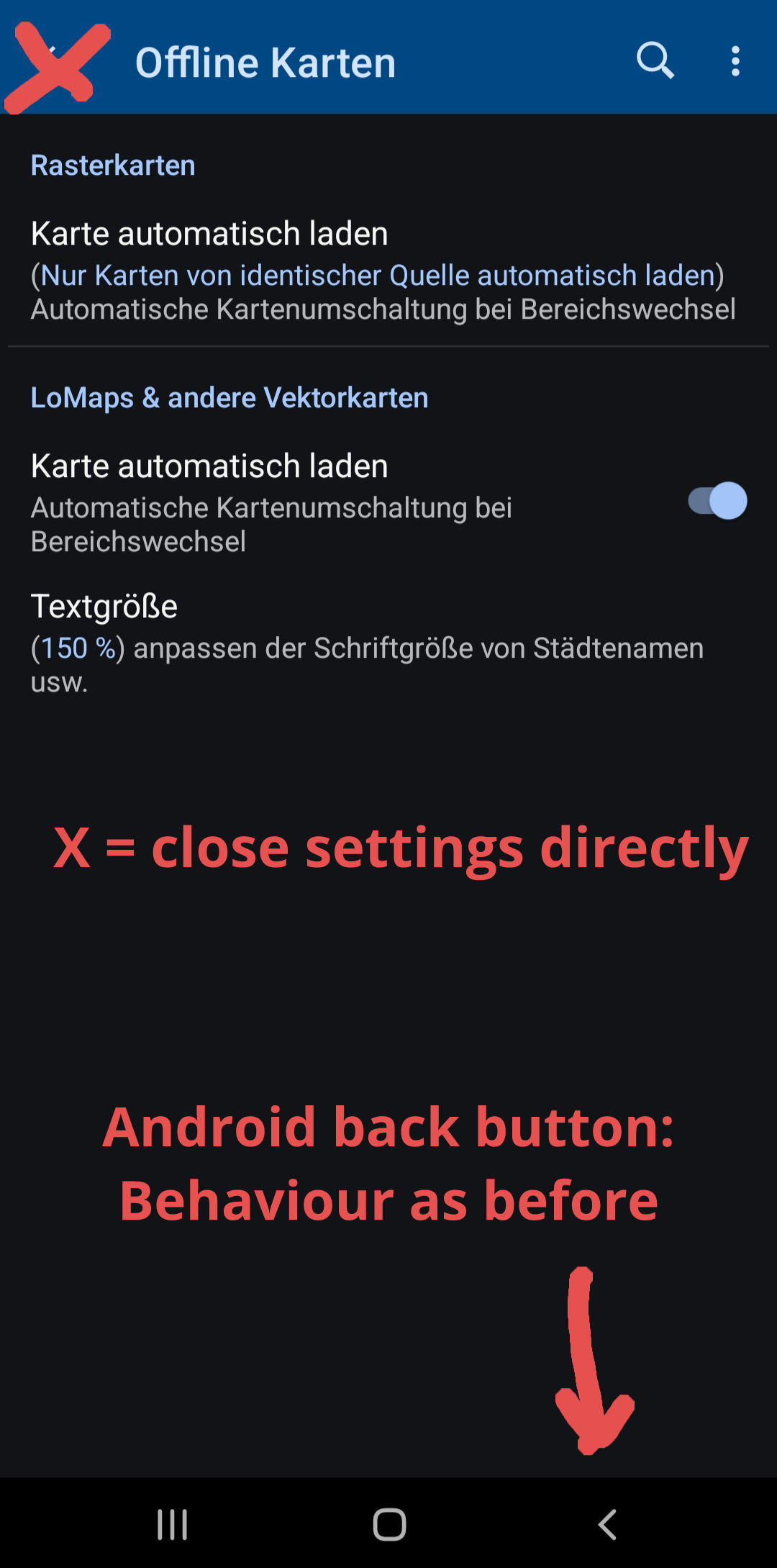 Example: I want to change the text size on the map. I go to Settings > Maps > Offline maps > Text size. I change the value there. Then I want to see what effect it has on the map.