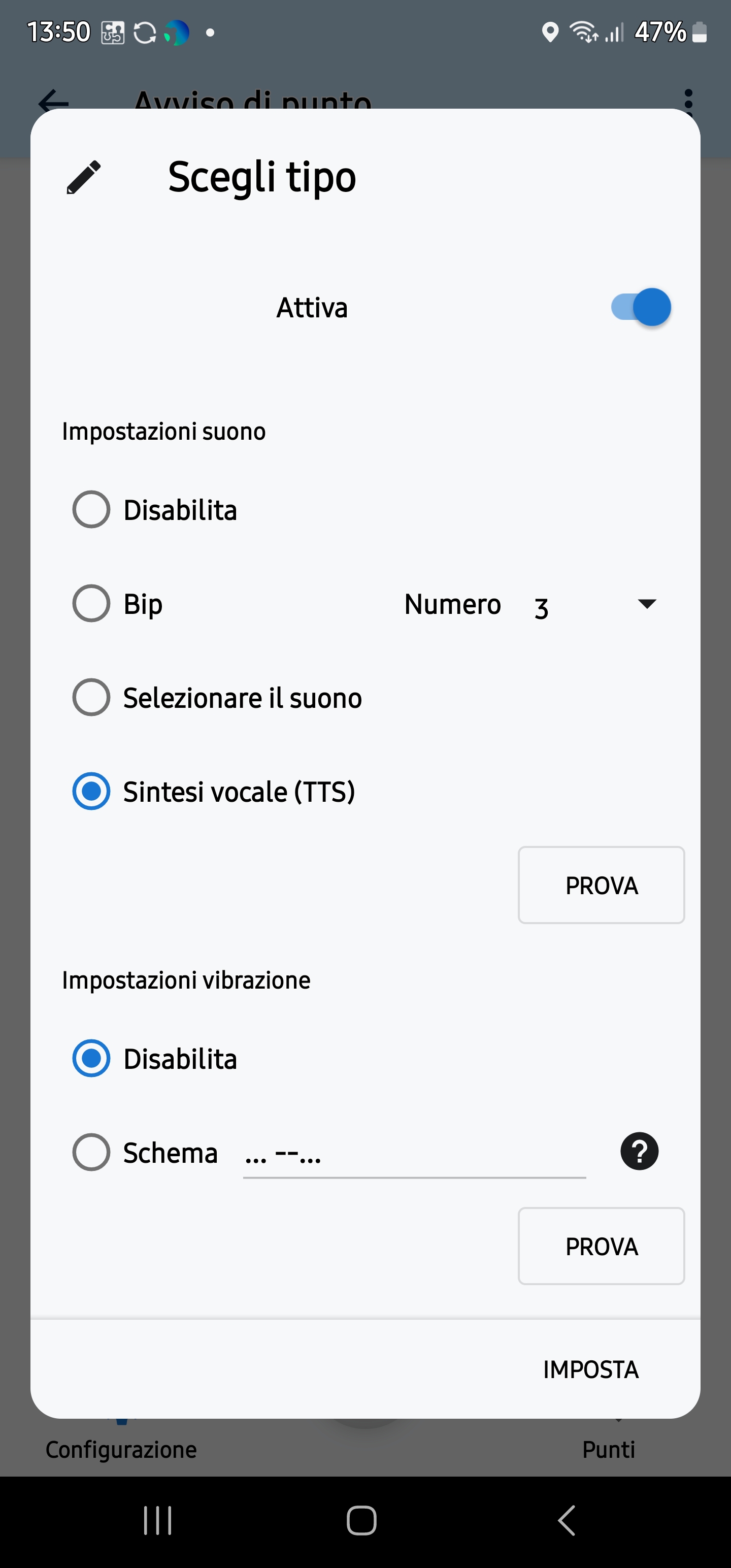 La sintesi vocale dei punti non funziona, ma già in fase di configurazione l'app abortisce. Vedi screenshot allegato: già premendo il pulsante "prova" l'app si chiude.