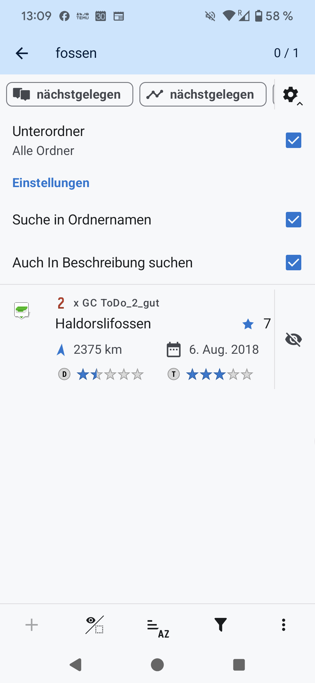 I am looking in my library for all points and tracks that have "fossen" (Norwegian: waterfall) somewhere in their name.