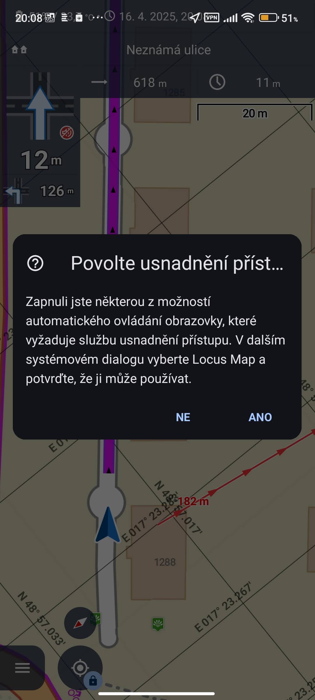 pokud se takovéto upozornění zobrazí, zřejmě máte v Locusu zapnuto automatické zapínání displeje při navigaci nebo ovládání gestem. Tato funkce vyžaduje systémové povolení usnadnění přístupu. Takže klepněte na "ano", zobrazí se systémové povolení k přístupu, v seznamu nainstalovaných aplikací najděte Locus Map a povolte pro něj přístup.