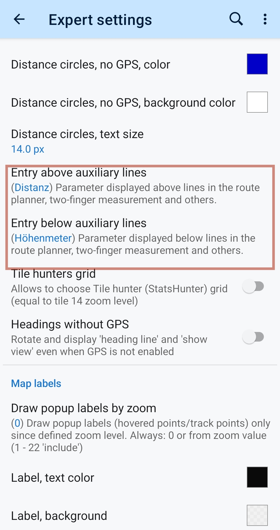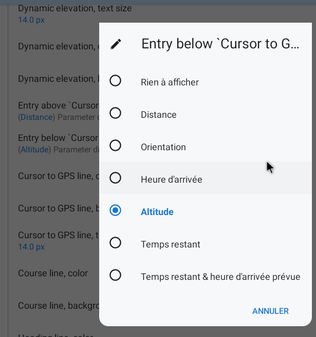 Changing expert setting "Entry above 'Cursor to GPS' " has no effect too (even if I select "Nothing to display"). It always show Distance. Always like attached picture (during use of the route planer).