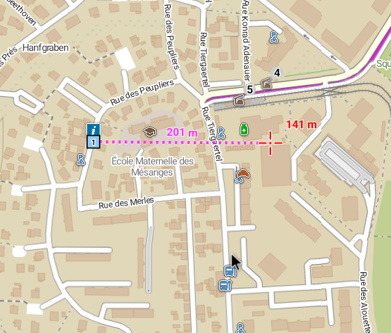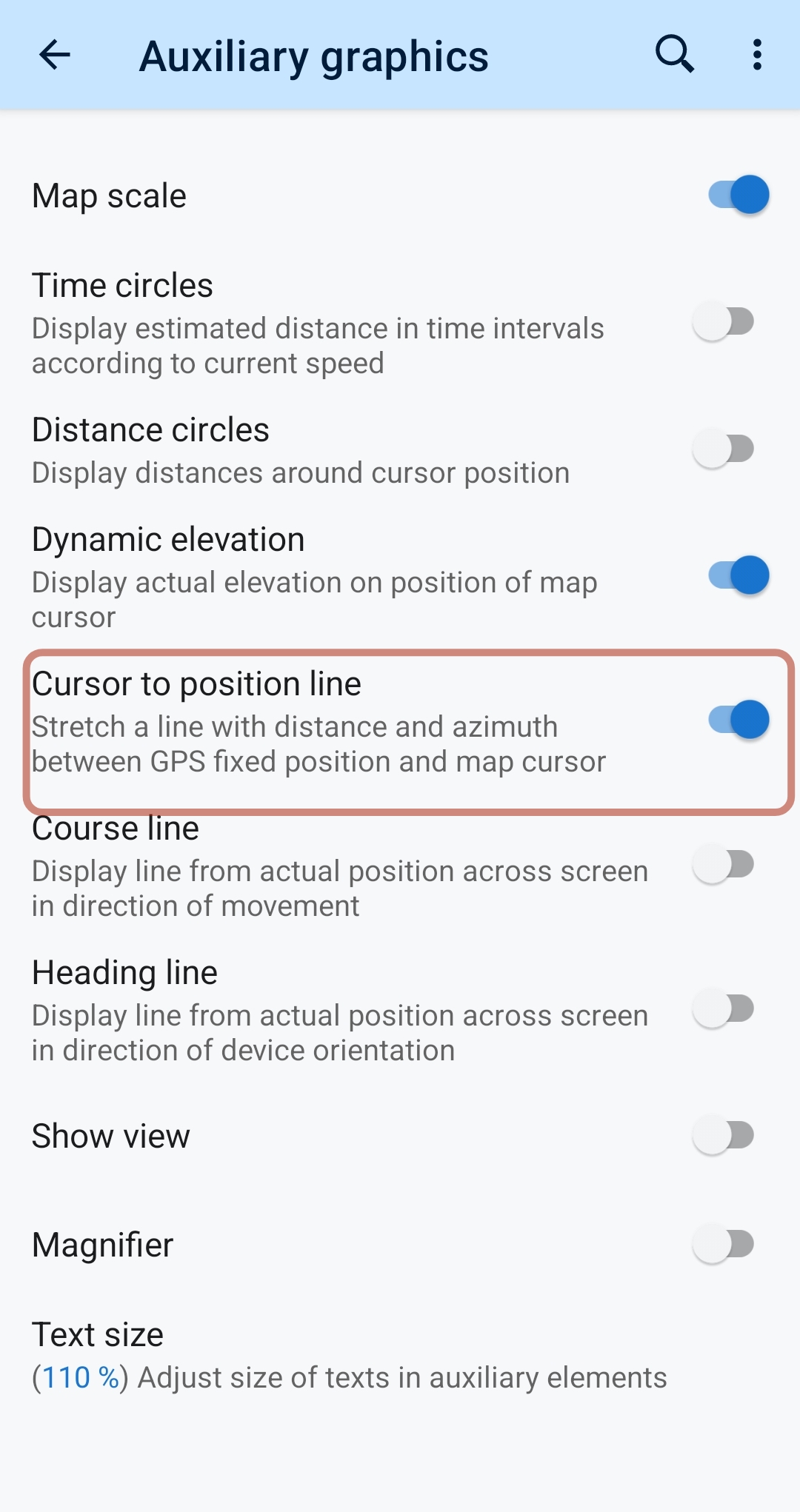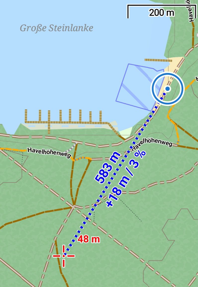 A dashed line is then displayed between your current GPS position and the cursor with the selected values. See screenshot 2.