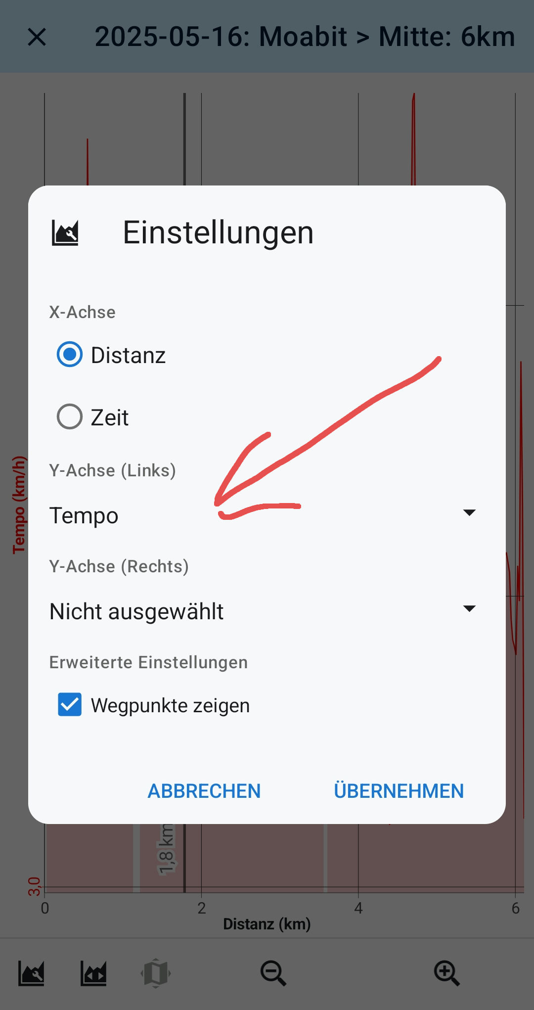 Click on the tool icon on the left under the elevation diagram and select the desired parameter (speed / tempo) in the menu that opens under "Y axis".