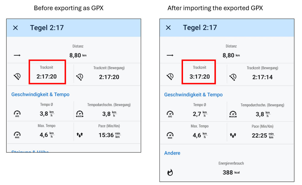 When I export a track as gpx and then import it again, the track time is regularly displayed as being exactly one hour too long.
