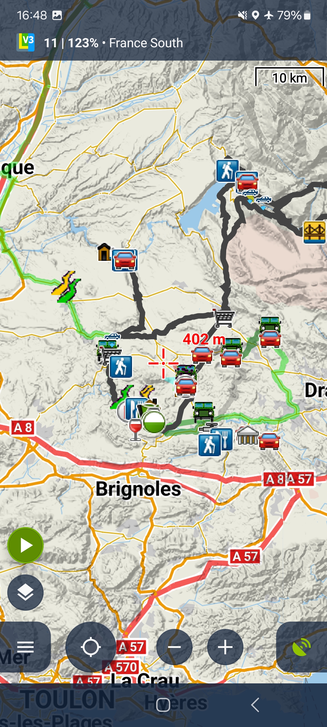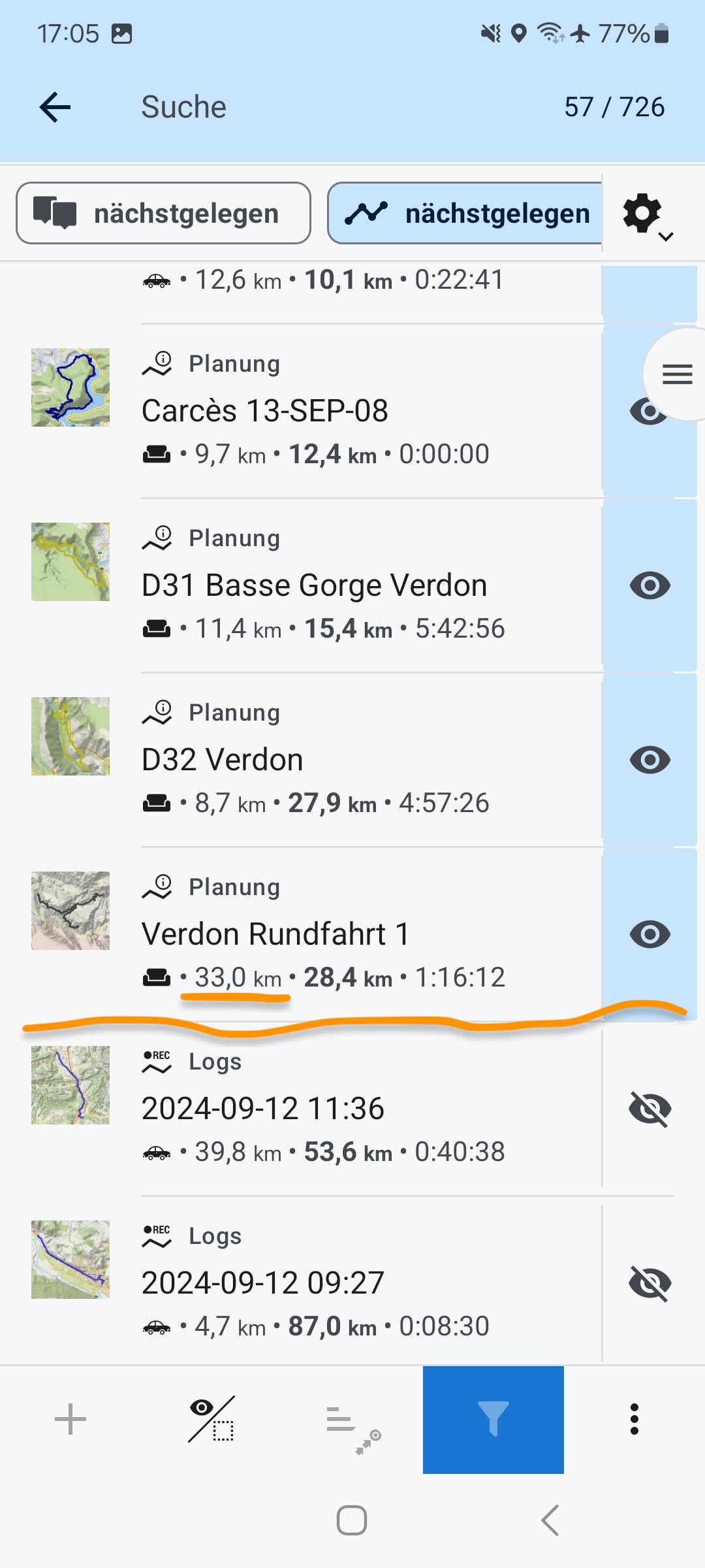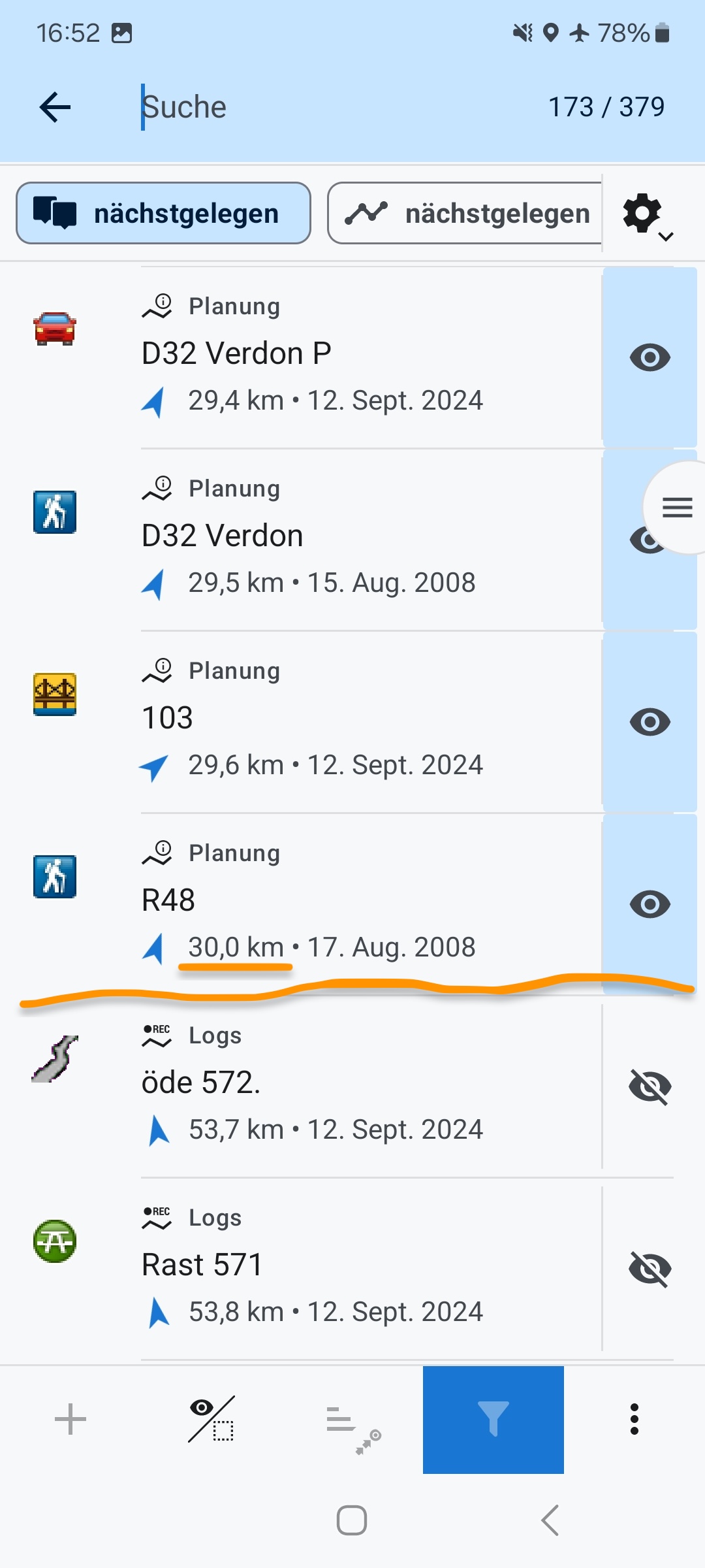This may seem similar to "points nearby" or "search by distance" but these have some shortcomings: you have to manually change the visibility of each point or track - which may be many and you have to guess the maximum distance based on the map scale (see screenshots 4 and 5).